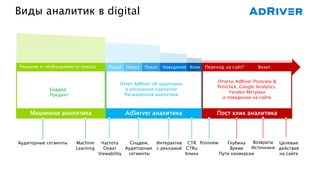 Документ представляет собой детализированный анализ взаимодействия с рекламой, включая метрики viewability и пост-клик аналитику, нацеленные на оценку эффективности рекламных кампаний. Приводятся примеры и кейсы из разных автобрендов, анализирующие влияние времени клика, частоты показов и времени загрузки сайта на конверсии. Обсуждаются также различные инструменты и подходы к аналитике, включая использование машинного обучения и системы веб-аналитики.