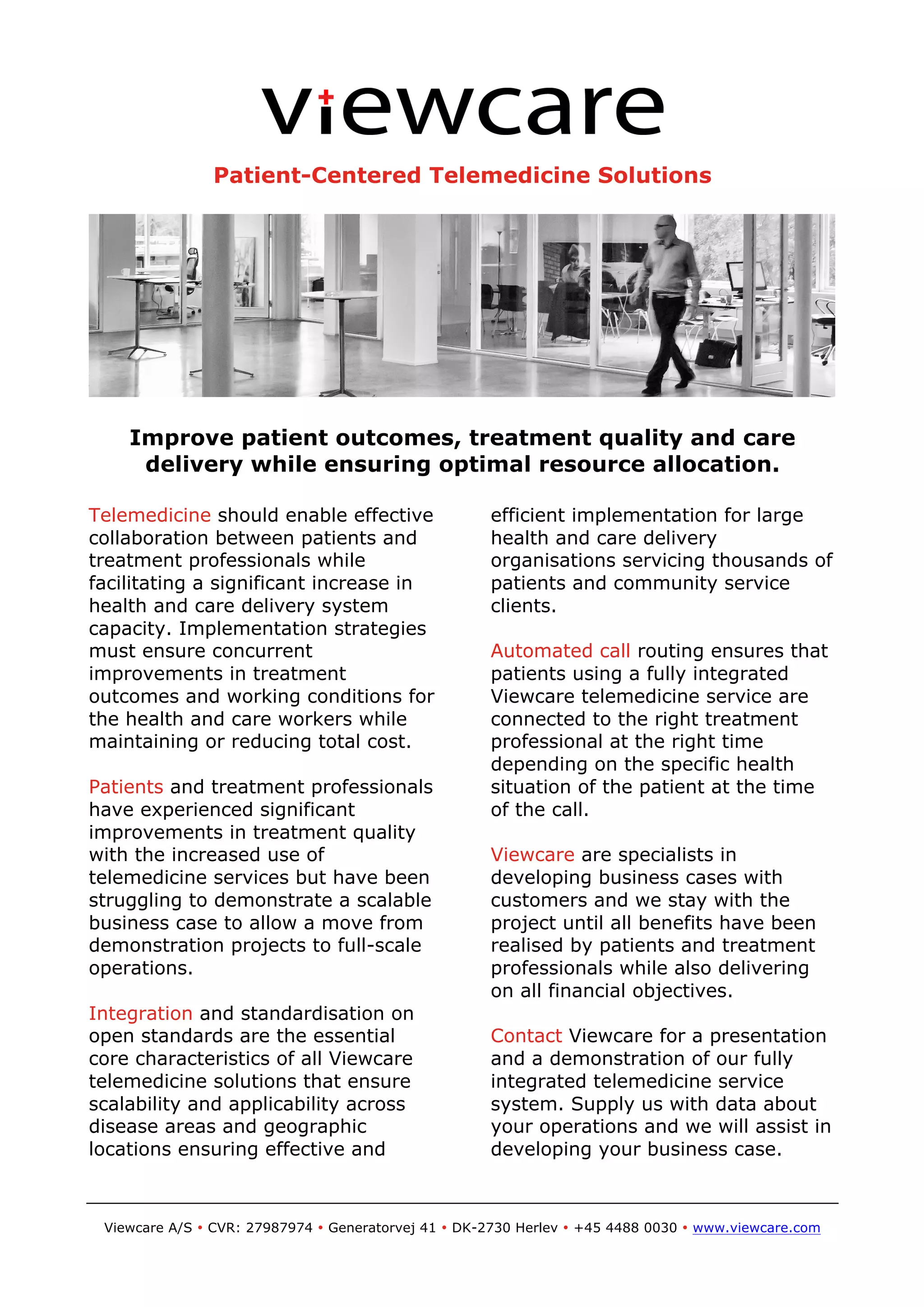 The document discusses Viewcare's patient-centered telemedicine solutions that aim to improve patient outcomes and care delivery while reducing costs. The solutions allow for effective collaboration between patients and healthcare professionals through remote monitoring and consultation. Viewcare's integrated platforms can be deployed quickly and used in various settings like the home, ambulance, or acute rehabilitation to facilitate treatment and care. Customers are encouraged to contact Viewcare to learn more about how their telemedicine services can help deliver healthcare.