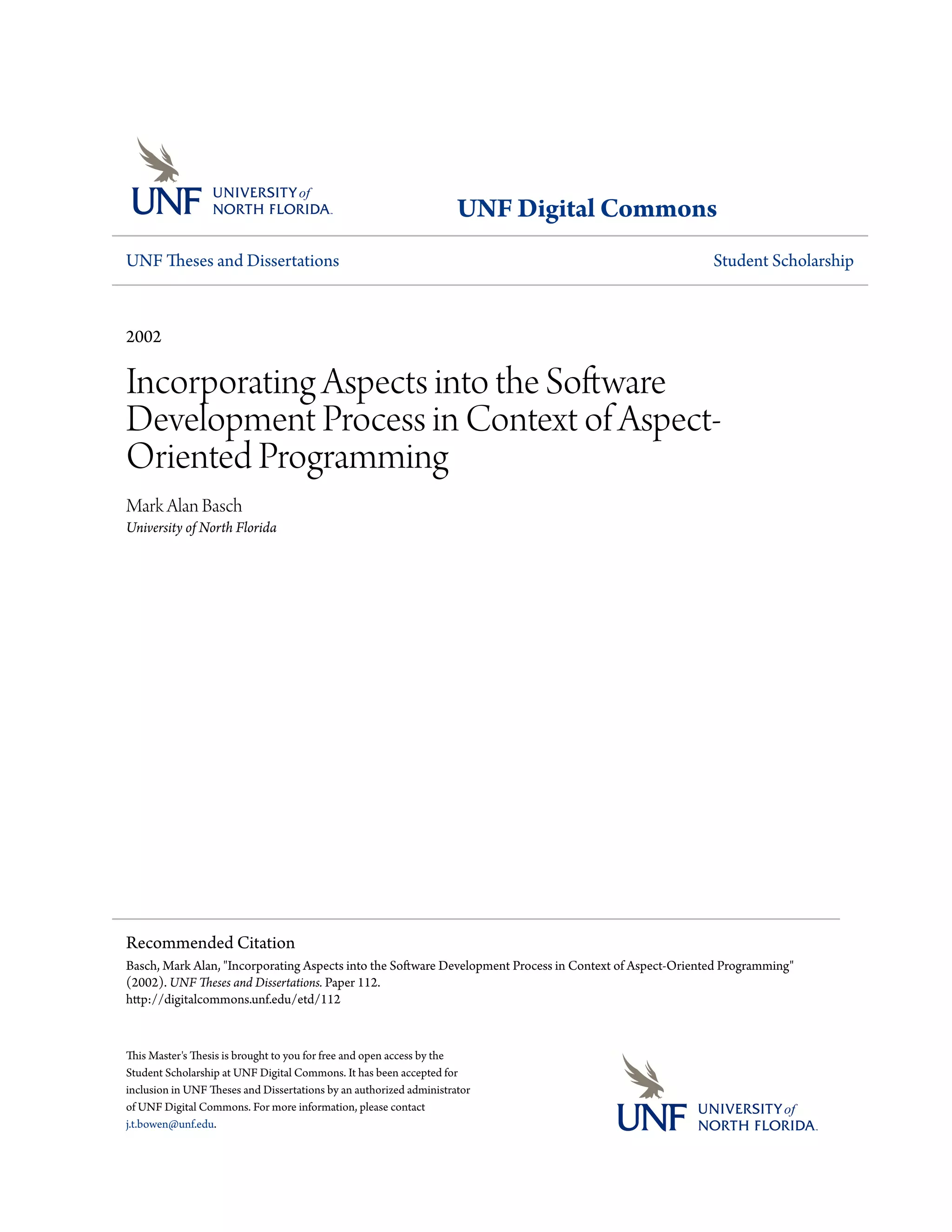 The document discusses a 2002 master's thesis titled "Incorporating Aspects into the Software Development Process in the Context of Aspect-Oriented Programming". The thesis proposes ways to model aspects using the Unified Modeling Language (UML) during software development. It reviews research on aspect-oriented programming and the software development process. It then presents proposals for incorporating aspects into the Unified Process phases and using UML diagrams like use case diagrams, class diagrams, and interaction diagrams to model cross-cutting concerns. The goal is to support aspect-oriented thinking throughout the software lifecycle.