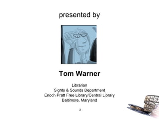 This document provides an overview of resources and strategies for librarians to use when providing viewers' advisory and recommendations for movies, television shows, and other audiovisual materials. It discusses genres, appeal factors, interview techniques, and lists numerous print and online resources for finding information on titles and determining what might appeal to different patrons.