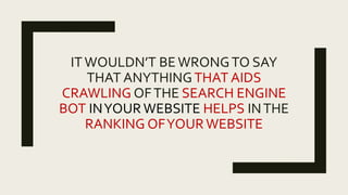 Crawling is important for search engine optimization. Elements that aid the crawling process of search engine bots, like inbound and outbound links, keywords, sitemaps, interlinking of pages, and relevant content, can help search engines discover more pages on a website and understand what information those pages contain. This deeper crawling allows search engines to better index a website and potentially boost its ranking in search results.