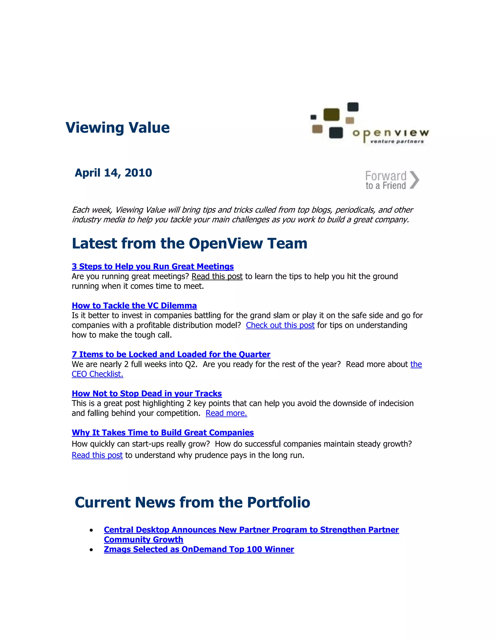 The document provides a weekly overview of tips and insights for entrepreneurs, including how to run effective meetings, approaches to venture capital, and a checklist for CEOs preparing for the upcoming quarter. It features articles on decision-making, building successful companies, and feedback mechanisms in business environments, along with updates about portfolio companies and additional resources. Highlights include lessons from Warren Buffett and tips for effective online marketing.