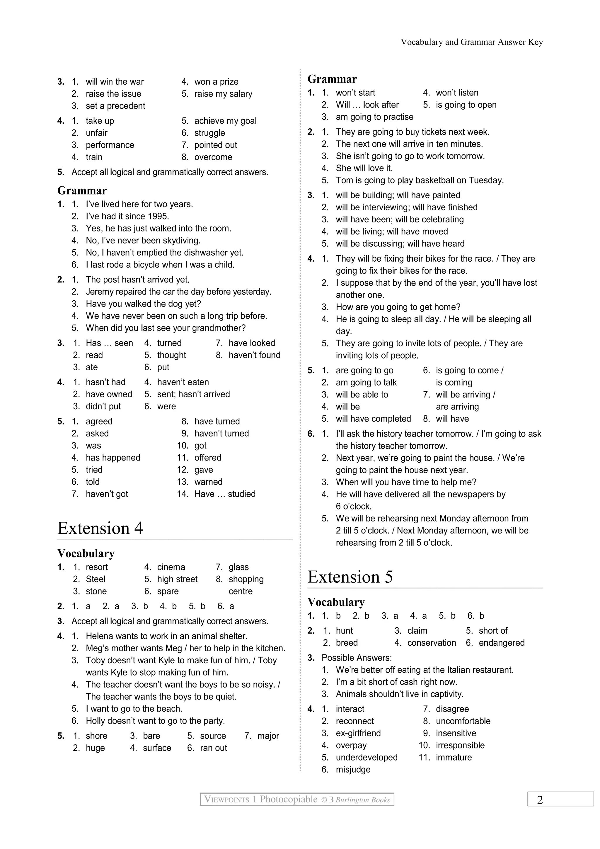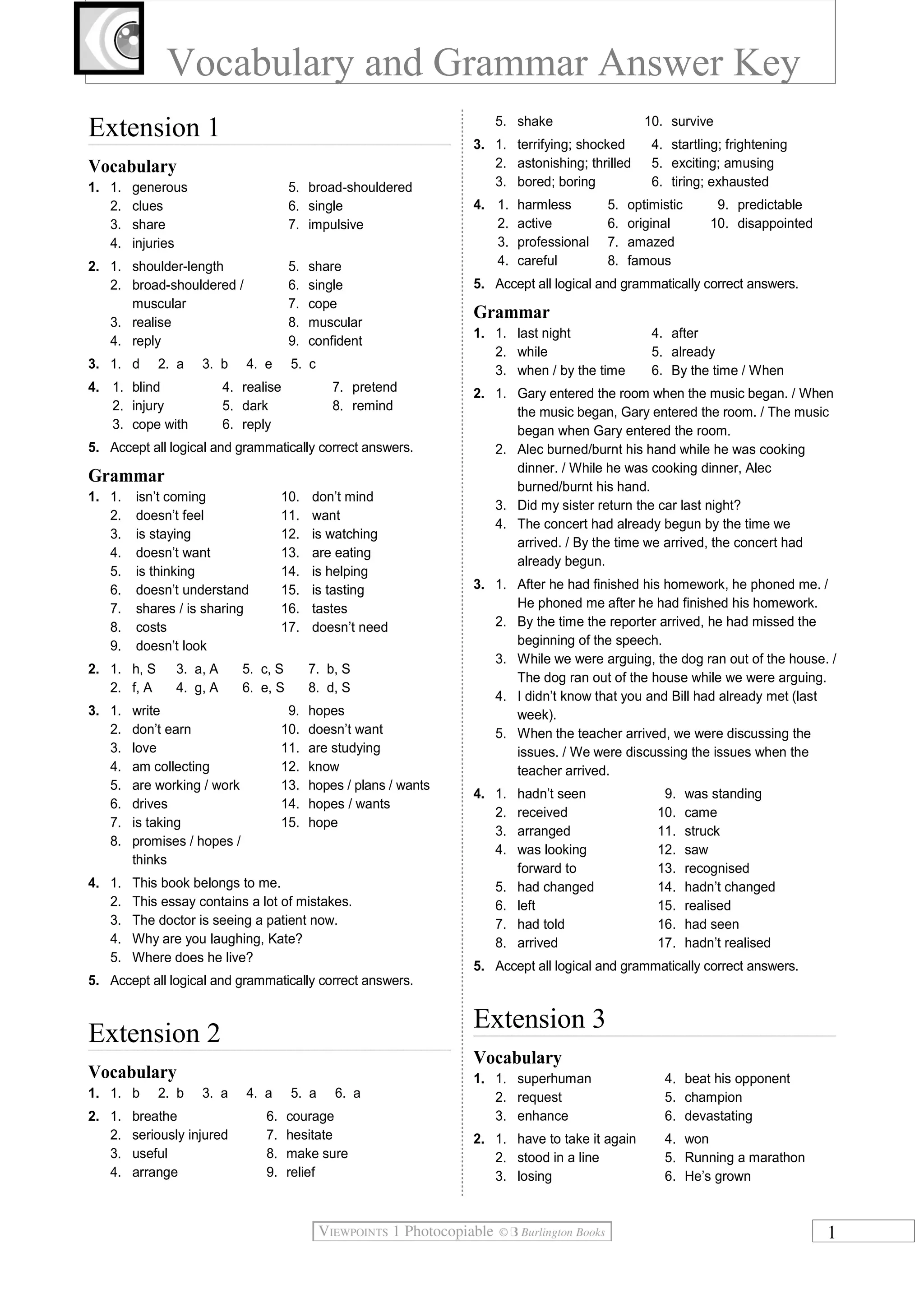 This document provides vocabulary and grammar answer keys for an English language extension exam. It includes answers to multiple choice and short answer questions that test vocabulary like generous, clues, and injuries, as well as grammar concepts like subject-verb agreement, tenses, and relative clauses. The document is divided into 7 sections that increase in difficulty and cover topics ranging from personality traits to weather phenomena to travel. It aims to comprehensively assess an examinee's mastery of English vocabulary and grammar.