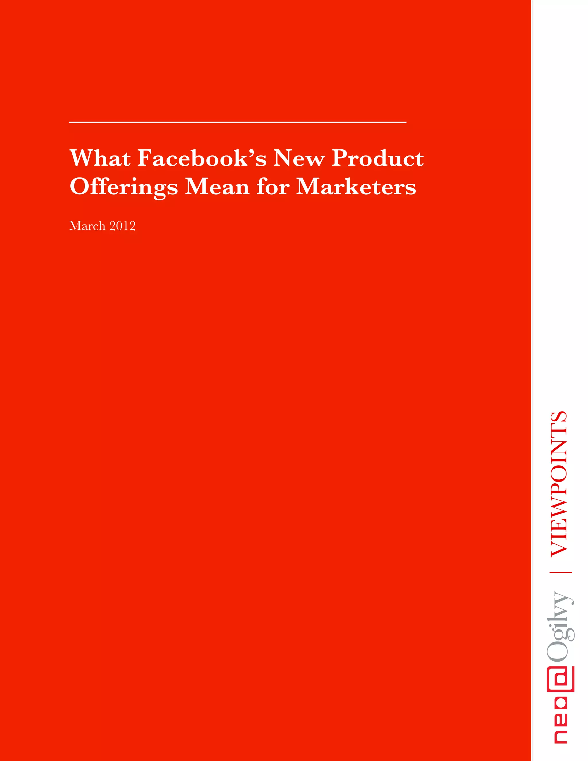The document discusses Facebook's new product offerings aimed at marketers introduced during the Facebook Marketing Conference in March 2012, highlighting features such as redesigned brand pages, premium ads, and real-time analytics. These changes emphasize the importance of storytelling and engaging content over traditional advertising, integrating paid, owned, and earned media strategies. As brands adapt to these updates, the document encourages experimentation with new tools to enhance customer connections and improve marketing outcomes.