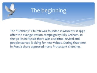 The Bethany Church was founded in Moscow in 1992 after Billy Graham's evangelization campaign. It grew to about 40 members by 2000 through spiritual awakening in Russia in the 1990s. In 2000, the pastor began inductive Bible study and teaching that helped the church grow spiritually. Since then, various ministries have been established including Bible studies, youth clubs, sports teams, camps and missionary work, and membership has grown to over 100. The church rents space for ministries but needs financial support of $3,000 per month for continued growth and effectiveness.