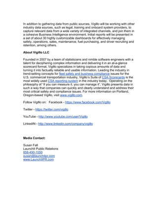 Vigillo introduced a new Big Data business intelligence platform called Athena that provides customizable interactive dashboards and reports. Athena gathers data from various sources and presents it in an easy to understand format to help trucking companies improve operational factors like safety, efficiency and profitability. Initial reports in Athena will focus on safety, operations, sales, maintenance, fuel purchasing, and driver recruiting through customizable dashboards. Vigillo will continue gathering data from public sources and work with industry partners to integrate additional relevant data sources into Athena.