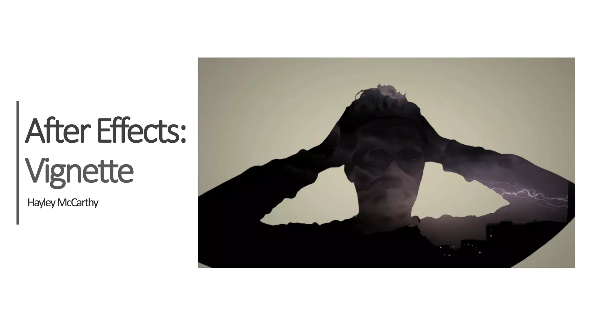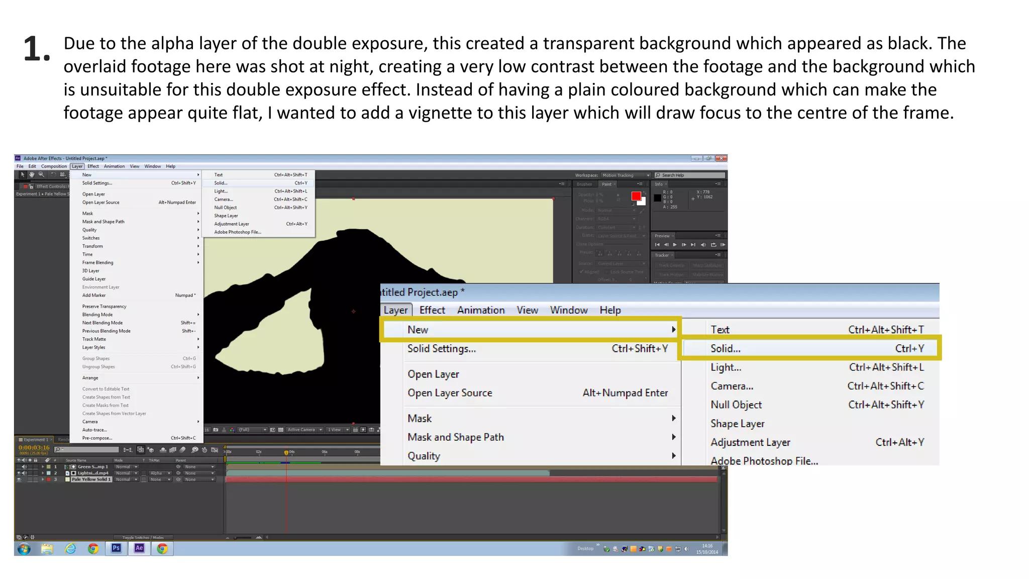 The document discusses adding a vignette effect to double exposure footage in After Effects. It describes creating a solid cream-colored background layer, then adding a black solid layer on top to act as the vignette. An ellipse shape layer is used to create a mask that subtracts the center, forming a black frame around the footage. The mask feather and opacity are adjusted to soften the edges and create a gradual gradient for the vignette.