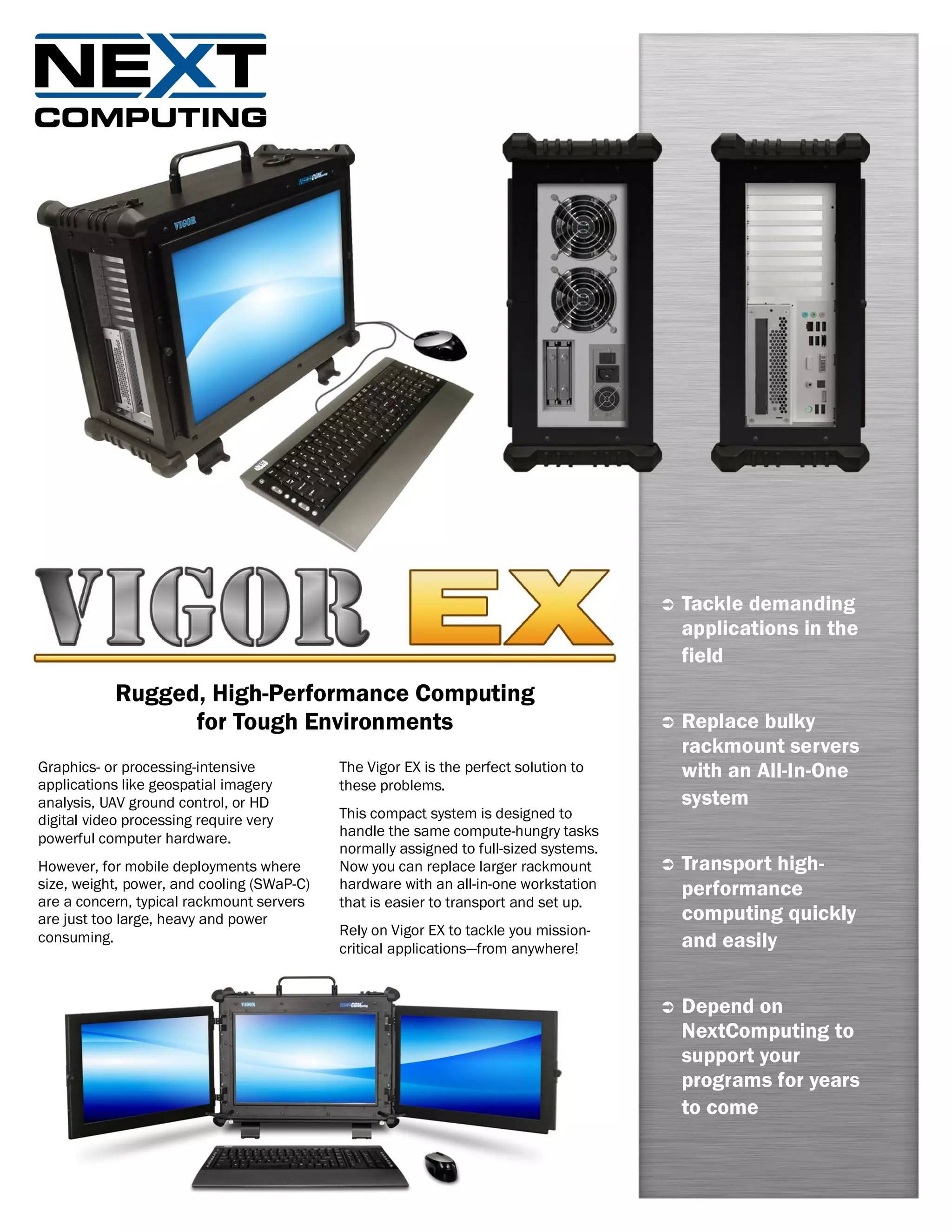 This document summarizes several rugged computing systems from NextComputing for demanding applications in tough environments. It provides an overview of key specifications for different models including available CPUs, memory, storage, I/O ports, operating systems supported, and environmental specifications. The systems are designed to replace bulky rackmount servers with compact all-in-one systems that can handle graphics-intensive and processing tasks in mobile deployments where size, weight, power and cooling are concerns.