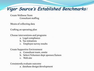 Vigor Source provides wellness consulting services to help companies establish wellness programs. Their services include staffing wellness teams, collecting health data, creating wellness plans and choosing interventions. Partnering with Vigor Source can boost a company's bottom line by reducing healthcare costs and increasing productivity. On average, their clients see a 28% reduction in sick leave, 26% reduction in health costs, and 30% reduction in workers compensation claims. Their goal is to enhance employee and corporate well-being through health risk reduction and promotion of fitness.