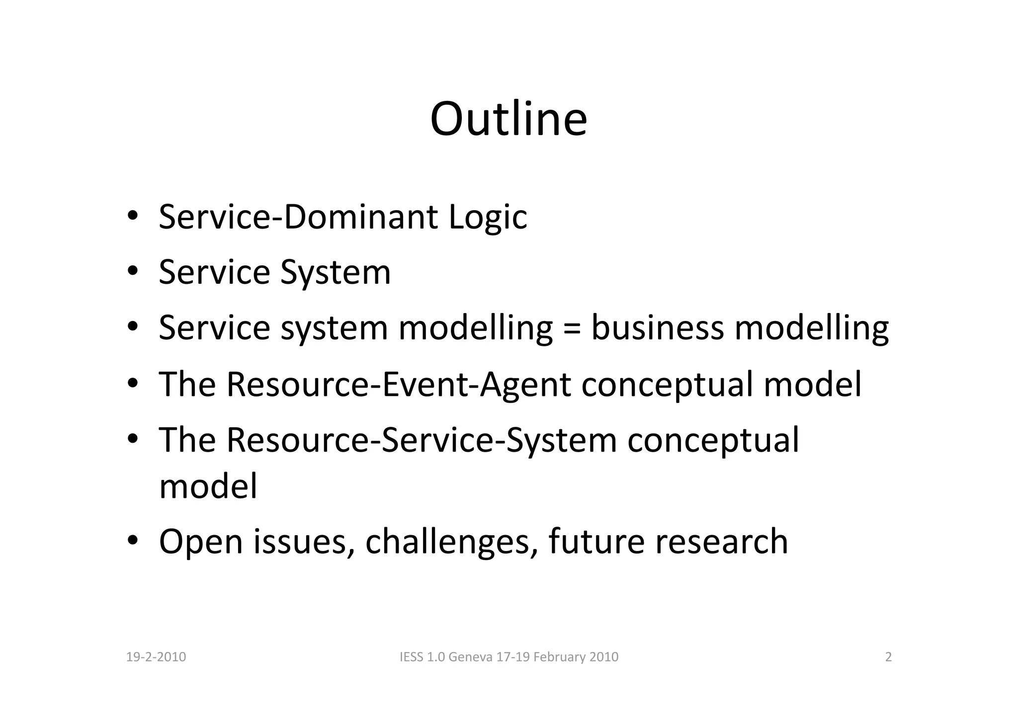 This document presents a conceptual model for service exchange based on service-dominant logic. It discusses key concepts in service-dominant logic like service systems and value co-creation. It proposes a resource-service-system model as an extension of the traditional resource-event-agent model to better capture the perspectives of service-dominant logic. Specifically, the model represents services as economic events rather than resources and shows how service systems interact and exchange resources to co-create value through services. The document concludes by outlining areas for future research like extending the model to capture the process and compositional aspects of services.