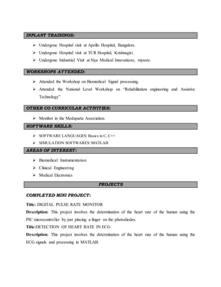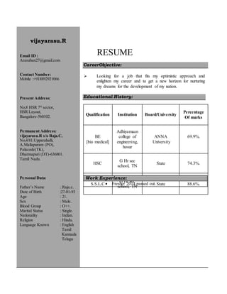 Vijayarasu R provides his contact information and addresses in Bangalore and Tamil Nadu. He completed his BE in biomedical engineering in 2014 with 69.9% marks. He has work experience in hospital visits and internships related to biomedical instrumentation, clinical engineering, and medical electronics. His projects include developing a digital pulse rate monitor using a microcontroller and analyzing ECG signals to determine heart rate. He is interested in biomedical fields and has skills in programming languages and simulation software.