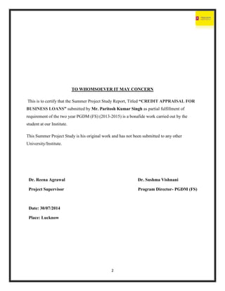 This document appears to be a summer training project report submitted for a Post Graduate Diploma in Management program. The report focuses on credit appraisal for business loans. It includes an executive summary that provides an overview of factors considered in credit appraisal like credit history and financial guarantees. It also discusses the importance of credit for banks and associated risks. The report aims to understand various technical aspects of appraising loans to business units and projects, including assessing working capital and term loans. It will also cover non-performing assets and debt restructuring.