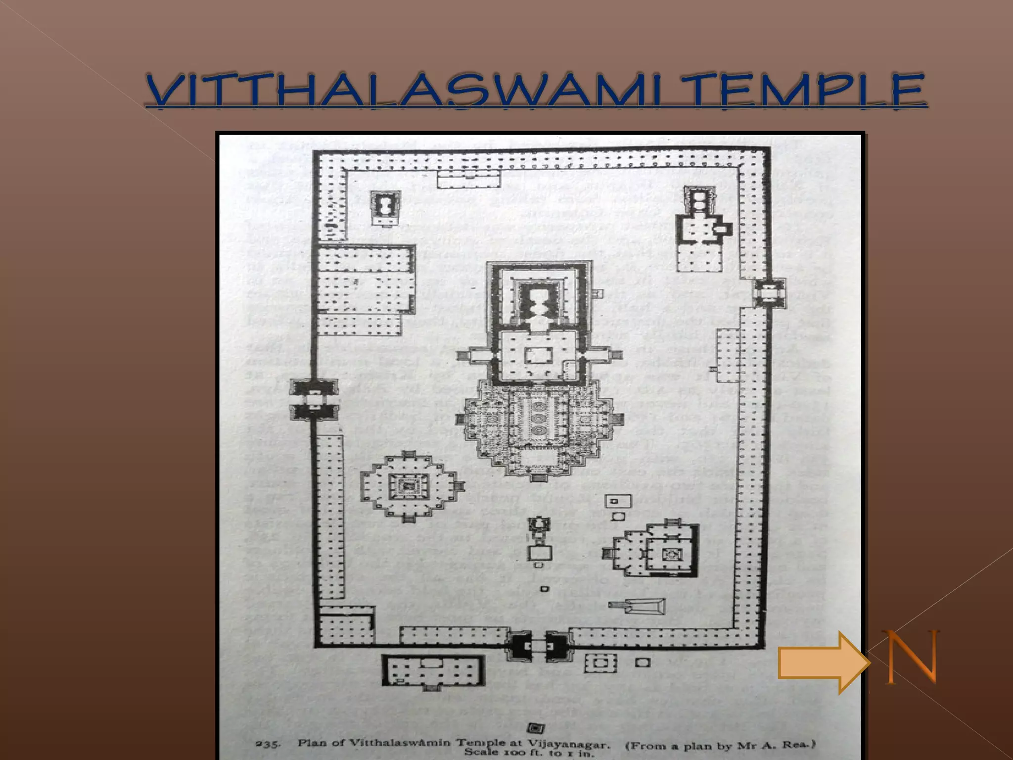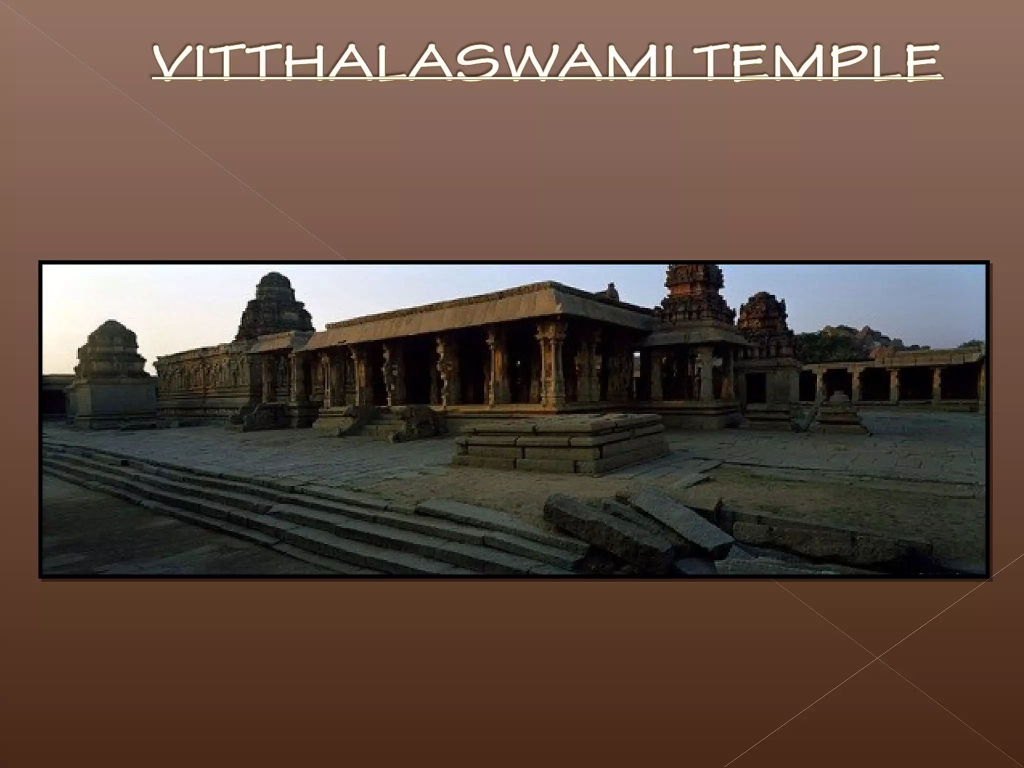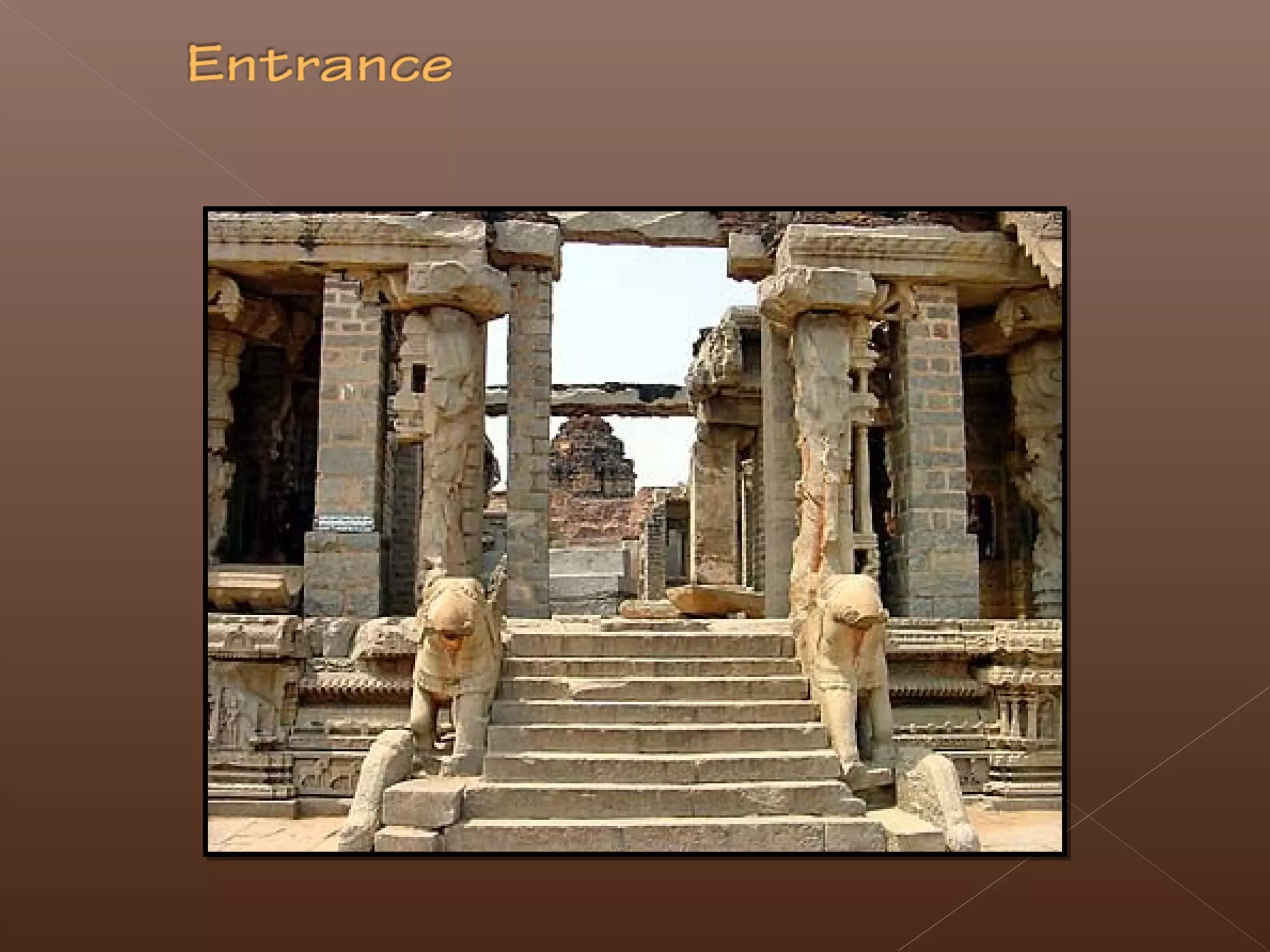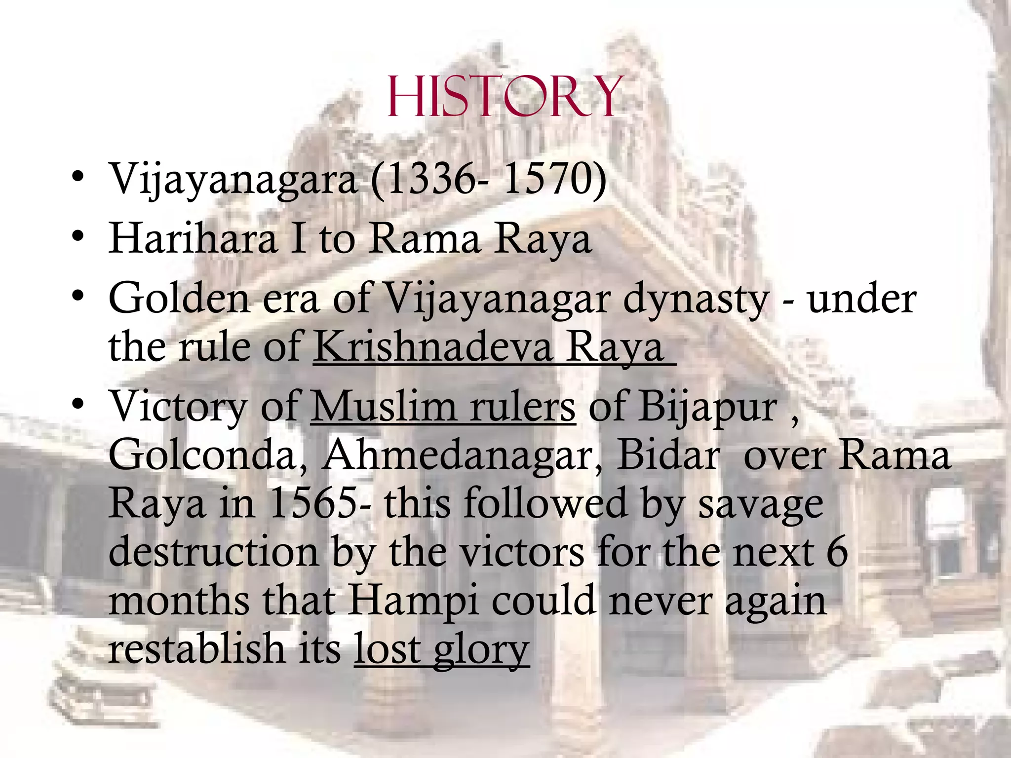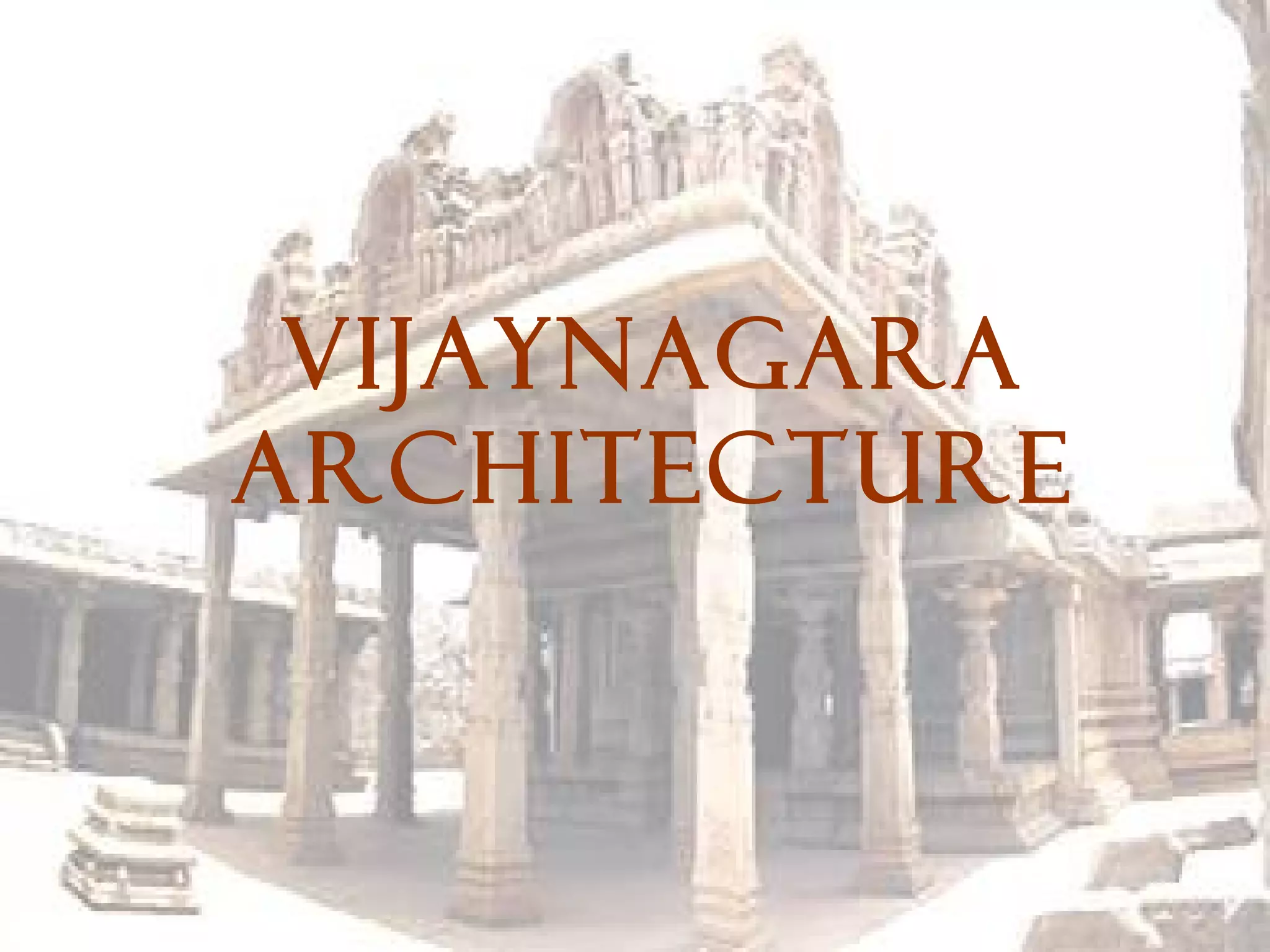 The document provides details about the Vijayanagara architecture found at the historic city of Hampi in India. Some key points: