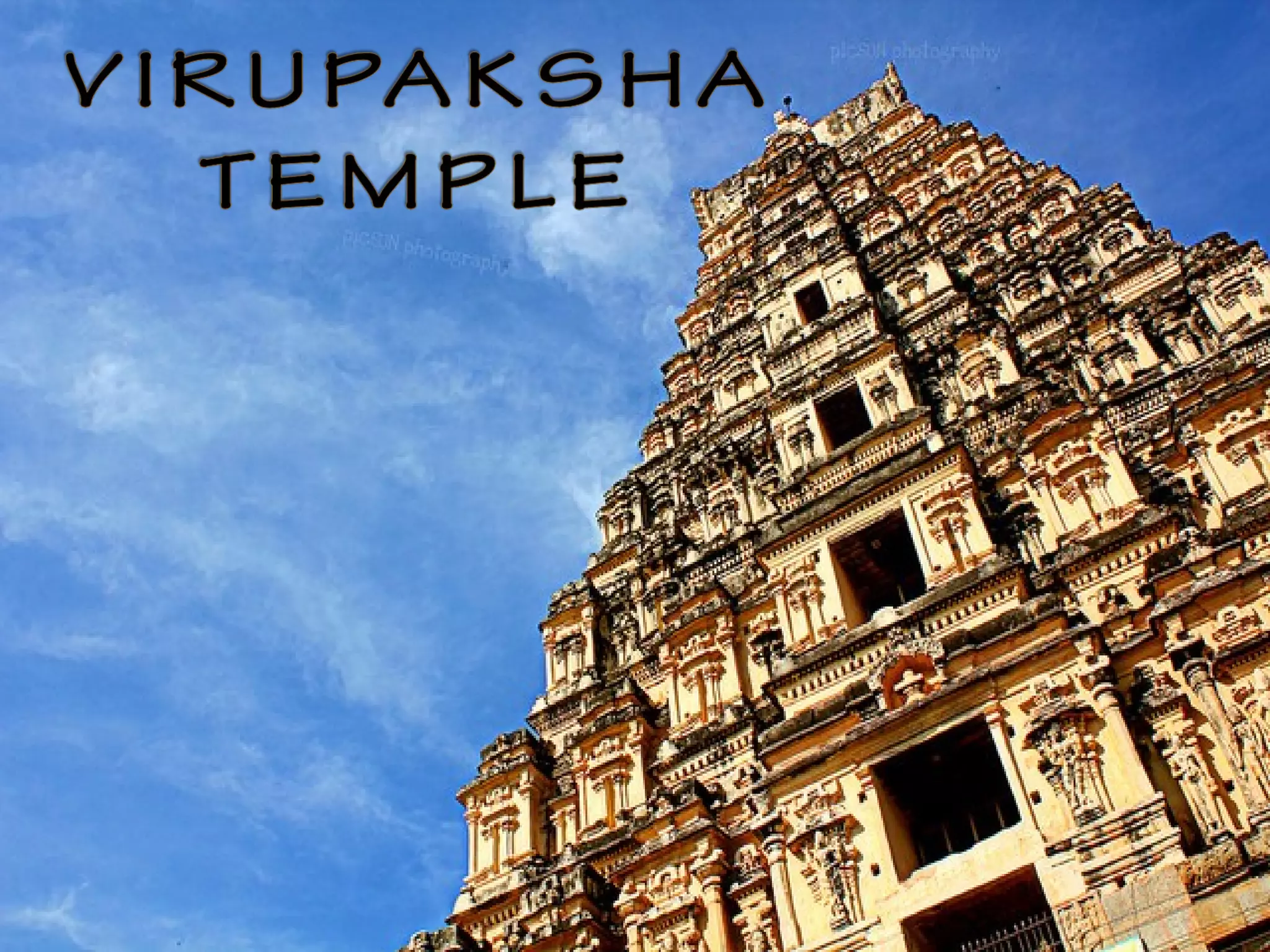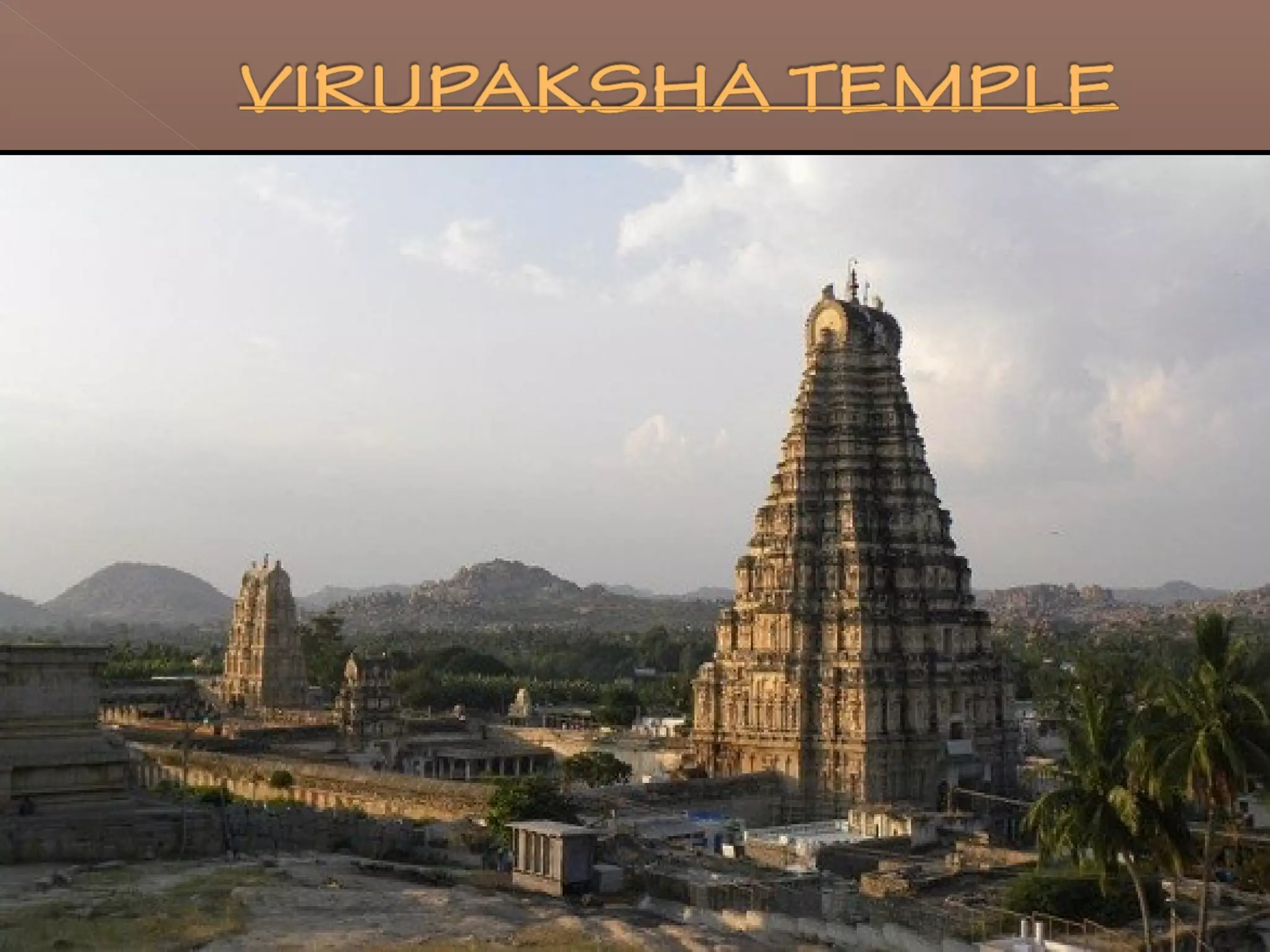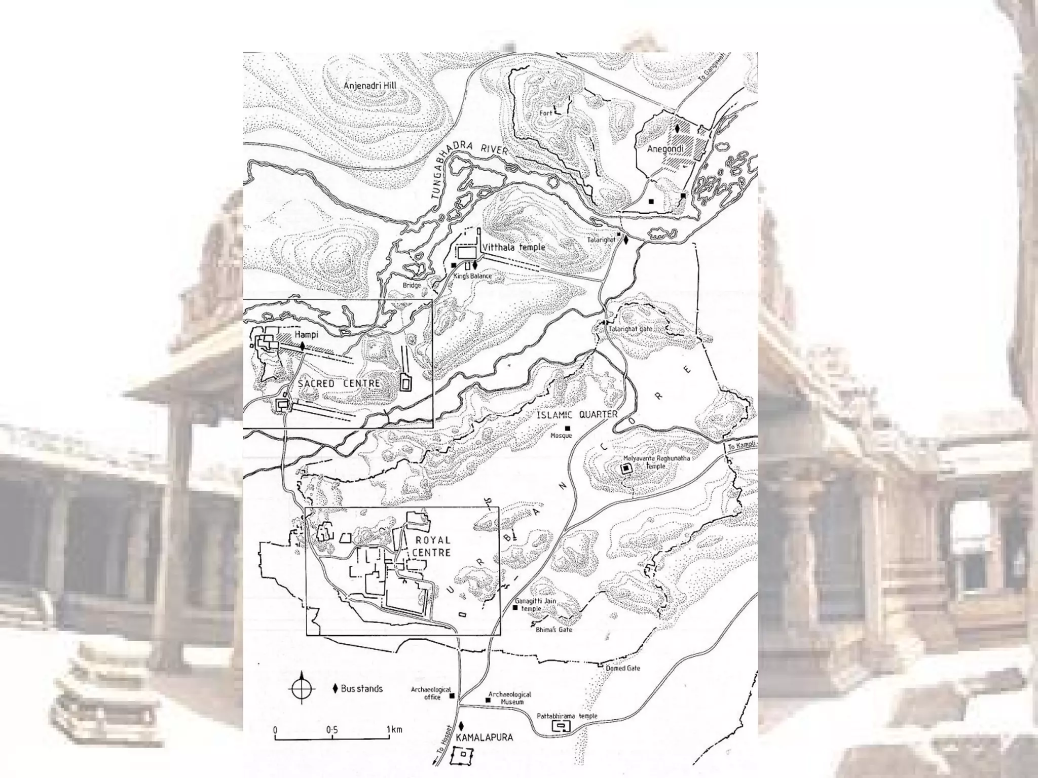1) The ruins are divided into the Royal Centre, where the kings lived, and the Sacred Centre along the river, which contains intricately decorated temples like the Virupaksha Temple.