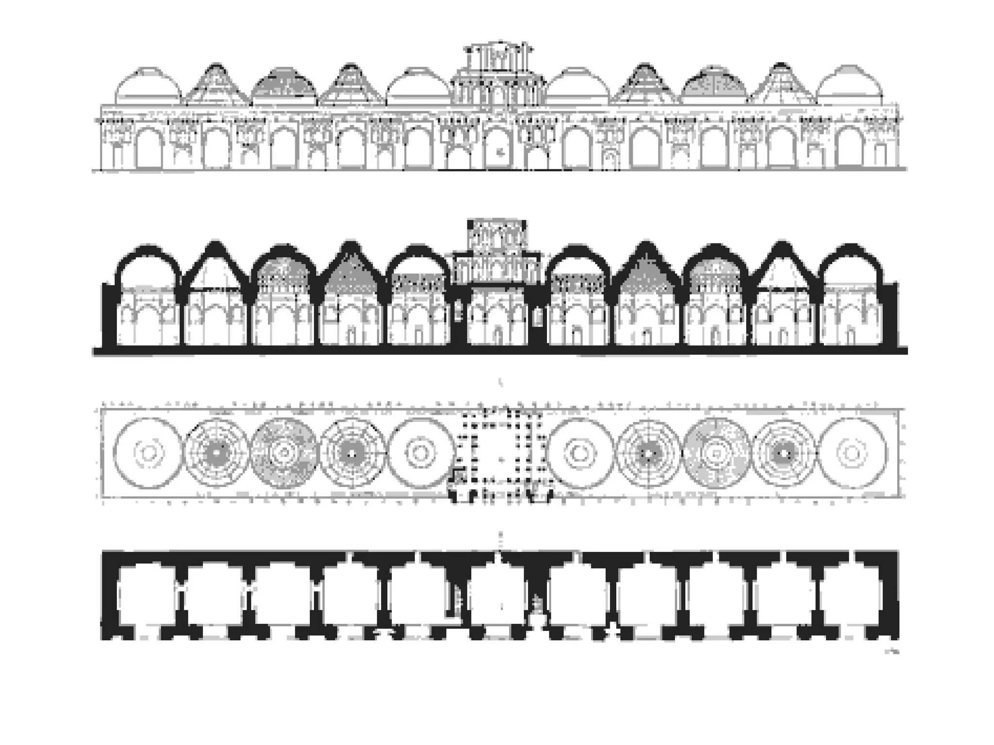 2) Architecture is modest in scale but spans large areas, using granite and chlorite stone. Pillars are decorated with horses, soldiers, and smaller pillars.