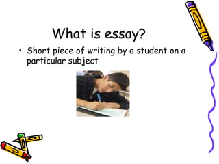 This document provides guidance on how to write an effective essay. It outlines that an essay should have an introduction paragraph, 3 body paragraphs with opinions and examples, and a conclusion paragraph. It stresses the importance of considering the target reader, using appropriate language, register, and accuracy to avoid errors. The key writing skills emphasized are planning before writing, writing unified paragraphs around a central topic, and reviewing for proper structure, grammar, and coherent connections between ideas.