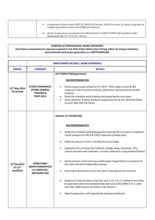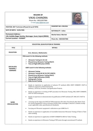 Vikas Chandra has over 7 years of experience as an NDT Technician specializing in phased array and TOFD techniques. He holds Level II certifications from PCN and ASNT in ultrasonic testing, phased array UT, TOFD, radiography, and eddy current testing. His experience includes writing procedures, performing inspections and data analysis, and preparing reports for equipment in the oil, gas, petrochemical and power industries. Currently he works as an AUT Inspector for Stork Cooperheat in Kuwait, where he is responsible for UT, PAUT, TOFD, eddy current and IRIS inspections.