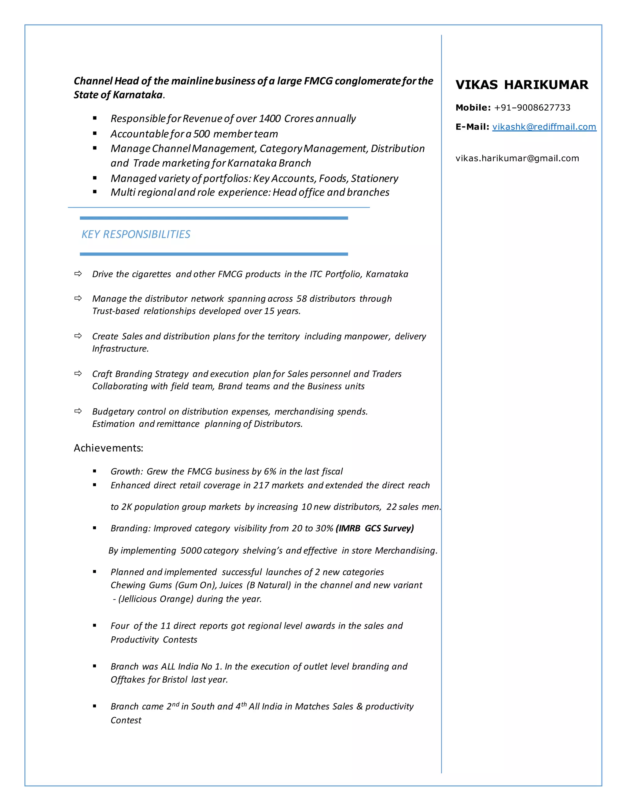 This document summarizes the experience of Vikas Harikumar as a Channel Head for a large FMCG conglomerate in Karnataka, India. He was responsible for over ₹1400 crores in annual revenue and managing a 500-member team. His role involved managing channel development, category management, distribution, and trade marketing. He achieved growth of 6% in the last fiscal year through expanding direct retail coverage and launching new product categories. Under his leadership, the branch was ranked first in India for outlet-level branding execution.