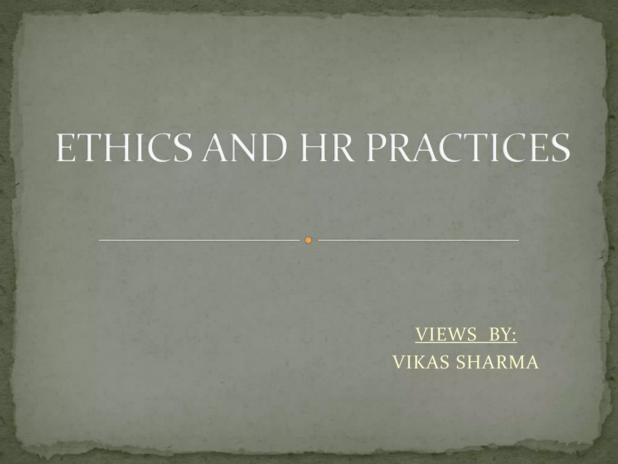This document discusses ethics and HR practices. It defines ethics as dealing with what is right and wrong. A code of ethics establishes expected behaviors and becomes part of an organization's culture. Unethical HR practices can occur in areas like recruitment, training, performance reviews, and industrial relations. Factors like individual characteristics, organizational culture, and societal norms can influence ethical behavior at work. When addressing issues, HR professionals should consider questions like whether an action is legal and compliant, matches organizational values, and is something they would be comfortable with if done to them. The document also presents a case study about suspected theft at a company and discusses potential courses of action and their legal implications.