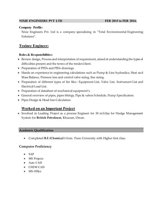 Vikash Kumar Suman has over 1.1 years of experience working as a Process Officer at EMBIO LIMITED (API) and as a Trainee Engineer at NIXIE ENGINEERS PVT LTD. He holds a B.E. in Chemical Engineering from Pune University. His experience includes developing production processes, preparing documentation such as PFDs and P&IDs, performing engineering calculations, and ensuring safety compliance. He is proficient in SAP, AutoCAD, CHEMCAD, and MS Office. Currently residing in Pune, Vikash is unmarried and seeks a position with a salary of 3.5 lacs that allows him to utilize his knowledge and efforts to achieve organizational goals.