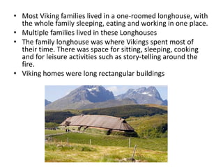 Viking families lived in long rectangular wooden buildings called longhouses that housed multiple families. Longhouses had a central firepit used for cooking and warmth, with space around it for sitting, sleeping, and activities. They had thatched roofs and stone foundations, with light coming from the fire, roof opening, and door. Poorer families sometimes lived with their animals indoors. Longhouses were clustered together for protection.