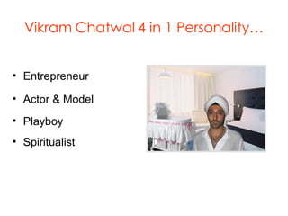 Vikram Chatwal is a successful entrepreneur, actor, model, and spiritualist. He inherited 11 luxury hotels from his father and went on to create his own independent hotel group with 9 luxury hotels in 5 cities. As an entrepreneur, he has won several awards for his hotels. As an actor and model, he has appeared in films like Zoolander and One Dollar Curry. He also dates many famous women. Chatwal practices spirituality through worship, reading religious texts, and keeping long hair and a turban. He is exploring opportunities in India's growing hospitality industry.