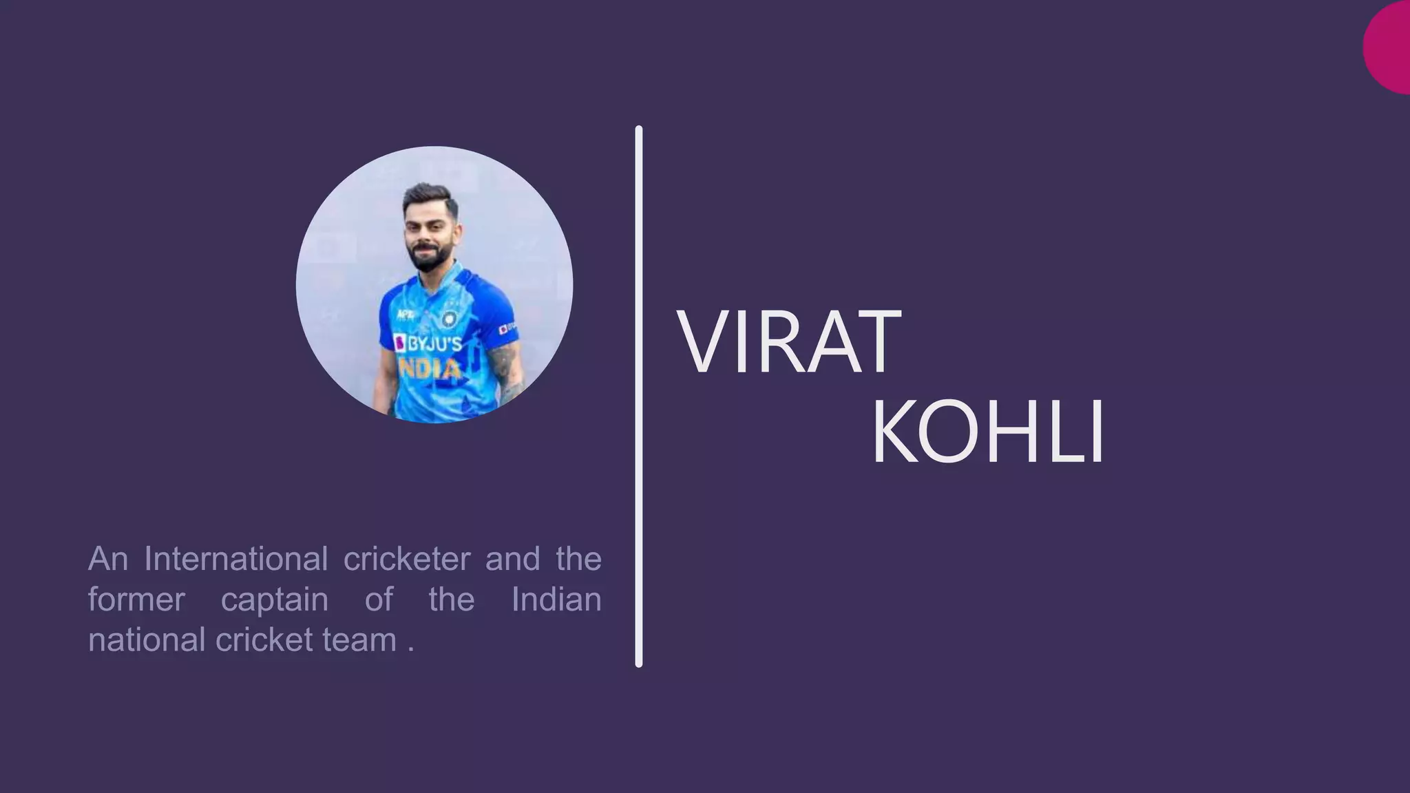 Virat Kohli is an Indian cricketer who was the former captain of the Indian national cricket team. He was born in 1988 in Delhi and began playing cricket at a young age, joining the West Delhi Cricket Academy. Kohli has had much success in his international career, making his debut for India in 2008 and being a key member of India's 2011 World Cup winning team. He holds numerous batting records including being the fastest to reach various milestones such as 1000, 3000, and 4000 runs in ODI cricket. In addition to his cricketing career, Kohli has also founded businesses in fashion and fitness.