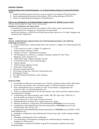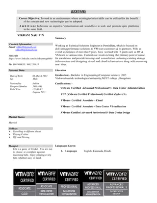 Vikram Nag seeks a position utilizing his technical skills and experience in virtualization. He has over 9 years of experience working with VMware and PernixData as a Technical Solutions Engineer, helping customers with virtual infrastructure design, implementation, and troubleshooting. He holds several VMware certifications and has expertise in technologies such as vSphere, vCloud Director, and NSX.