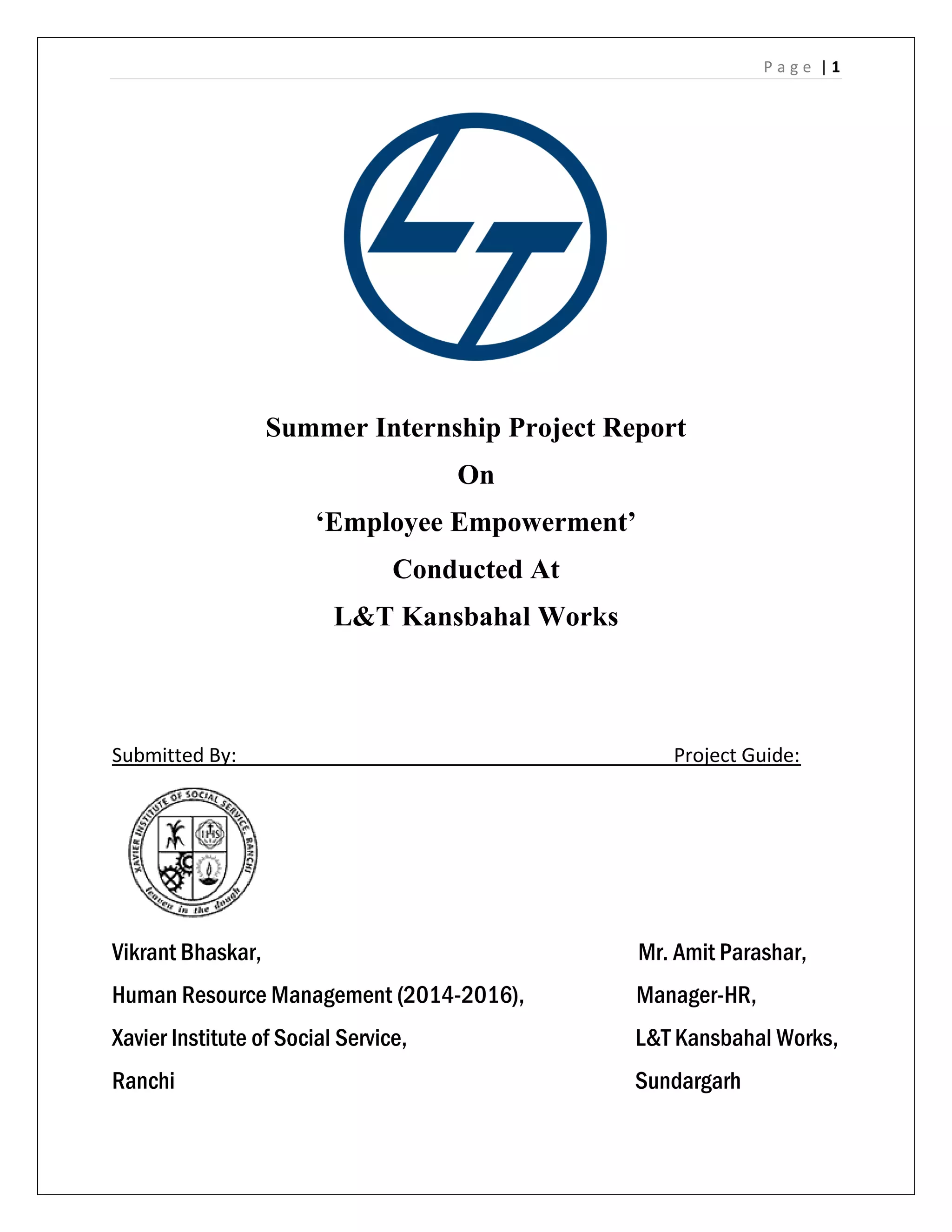 This document provides an overview of Larsen & Toubro Limited (L&T) and its Kansbahal Works unit. It discusses L&T's history, vision, mission, management style, and facilities at Kansbahal Works. Kansbahal Works is a major manufacturing facility of L&T located in Orissa that produces machinery for industries such as mining, cement, and wind turbines. The document outlines the various production capabilities at Kansbahal Works such as its foundry, fabrication, machine, and other shops. It also lists some of the key products manufactured including wind turbine components.
