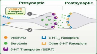 Vilazodone is a serotonin partial agonist and reuptake inhibitor (SPARI) antidepressant approved for treatment of major depressive disorder. It has a dual mechanism of action - selective serotonin reuptake inhibition and high-affinity partial agonism of serotonin 5-HT1A receptors. This dual action provides faster onset of antidepressant effects within 1-2 weeks. Studies have shown vilazodone to be effective and well-tolerated for short-term and long-term treatment of MDD, with comparable efficacy to SSRIs like escitalopram. It has fewer sexual side effects than SSRIs. The recommended dosage range is 40 mg per day.