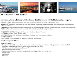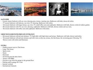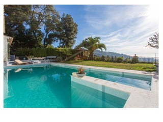 This unique villa has 9 bedrooms, 2 staff bedrooms, 700 square meters of living space, and 2000 square meters of garden space. It offers greatness and space through large communal areas opening to outdoor views. Each guest can have intimacy through separate terraces, balconies and ensuite bedrooms. The villa provides a friendly atmosphere with several large, open rooms for gathering. Most rooms have south-facing windows and sea, hill and garden views.