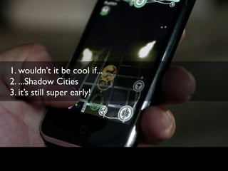 The document introduces Shadow Cities, a new social media project by Ville Vesterinen that allows users to share experiences and memories tied to specific locations within cities. It is still in early development but aims to help new social connections form around shared places and highlight the unique character of different neighborhoods and communities. Users are invited to dream about the kind of city they would like to see.