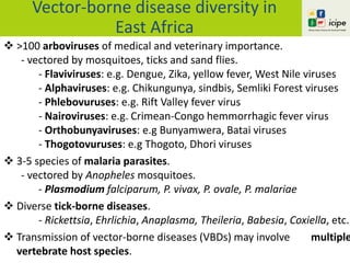 This document discusses using high-resolution melting analysis (HRM) to conduct integrated surveillance of vectors, pathogens, and host species in East Africa. It describes using HRM to identify over 100 arboviruses transmitted by mosquitoes and ticks in the region, including flaviviruses, alphaviruses, phleboviruses, nairoviruses, orthobunyaviruses, and thogotoviruses. The document also discusses using HRM to identify mosquito vector species and differentiate among arboviruses in a multiplex reaction with degenerate primers. Finally, it presents results demonstrating the ability of HRM to distinguish among several arboviruses.