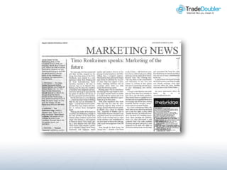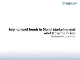 This document discusses international trends in digital marketing. It notes that mobile and video are growing advertising mediums, and that data is crucial for measuring results. Spending is shifting from traditional TV to digital media like online advertising, online retail, travel and ecommerce. Mobile internet usage is rising rapidly and will surpass desktop usage within 5 years. The document outlines top sources of digital ad revenue and how various digital marketing tactics can be used together to maximize offline sales.