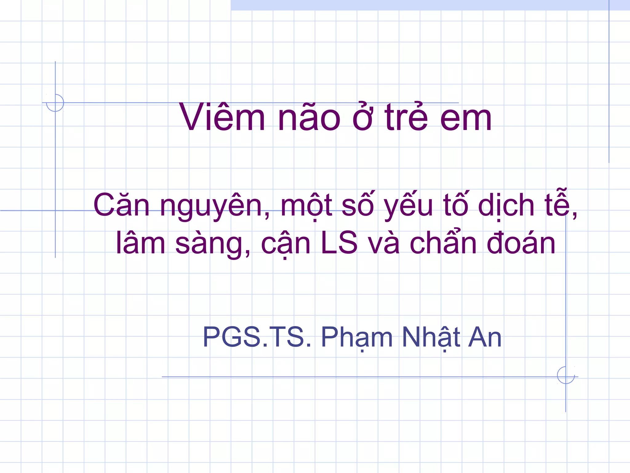 Tài liệu cung cấp thông tin về viêm não ở trẻ em, bao gồm căn nguyên, đặc điểm dịch tễ, triệu chứng lâm sàng, cận lâm sàng và phương pháp chẩn đoán, điều trị. Viêm não có thể là tiên phát do virus tấn công trực tiếp vào não hoặc thứ phát sau các bệnh nhiễm trùng khác. Tài liệu nêu rõ các loại virus và vi khuẩn thường gặp tại Việt Nam cùng với các phương pháp điều trị khẩn cấp và hỗ trợ.