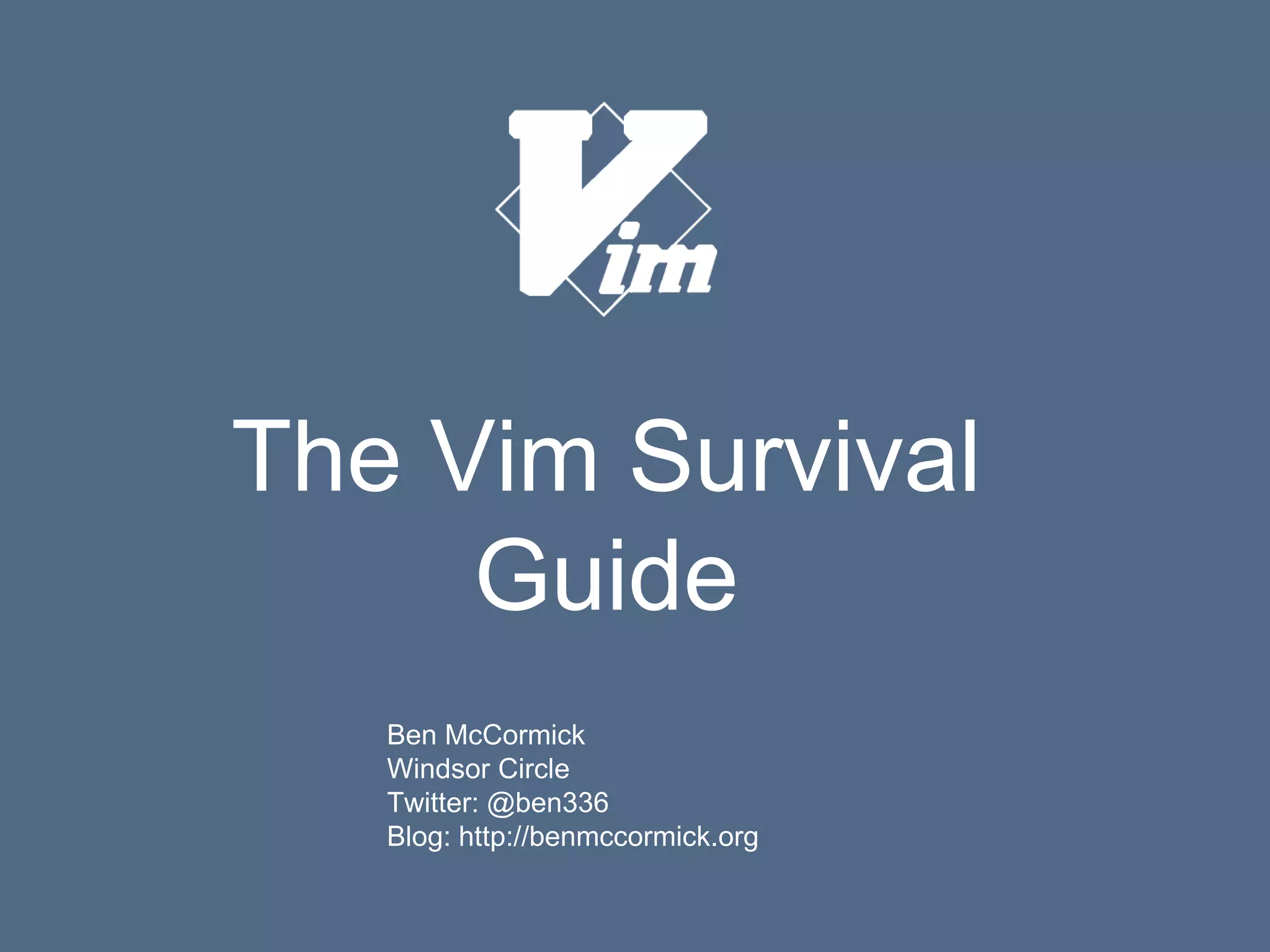 The document discusses the Vim text editor. It begins by introducing the author and providing a brief description of Vim as an open-source terminal-based text editor created in 1991. It then outlines the structure of the document, which will cover surviving Vim as a beginner and using Vim's advanced features. The document discusses Vim's reputation, both fair criticisms around its learning curve and myths. It also touches on editor wars and differences between Vim and other editors. Finally, it explores using Vim as a powerful and flexible editor through configuration, plugins, and its modal command language.