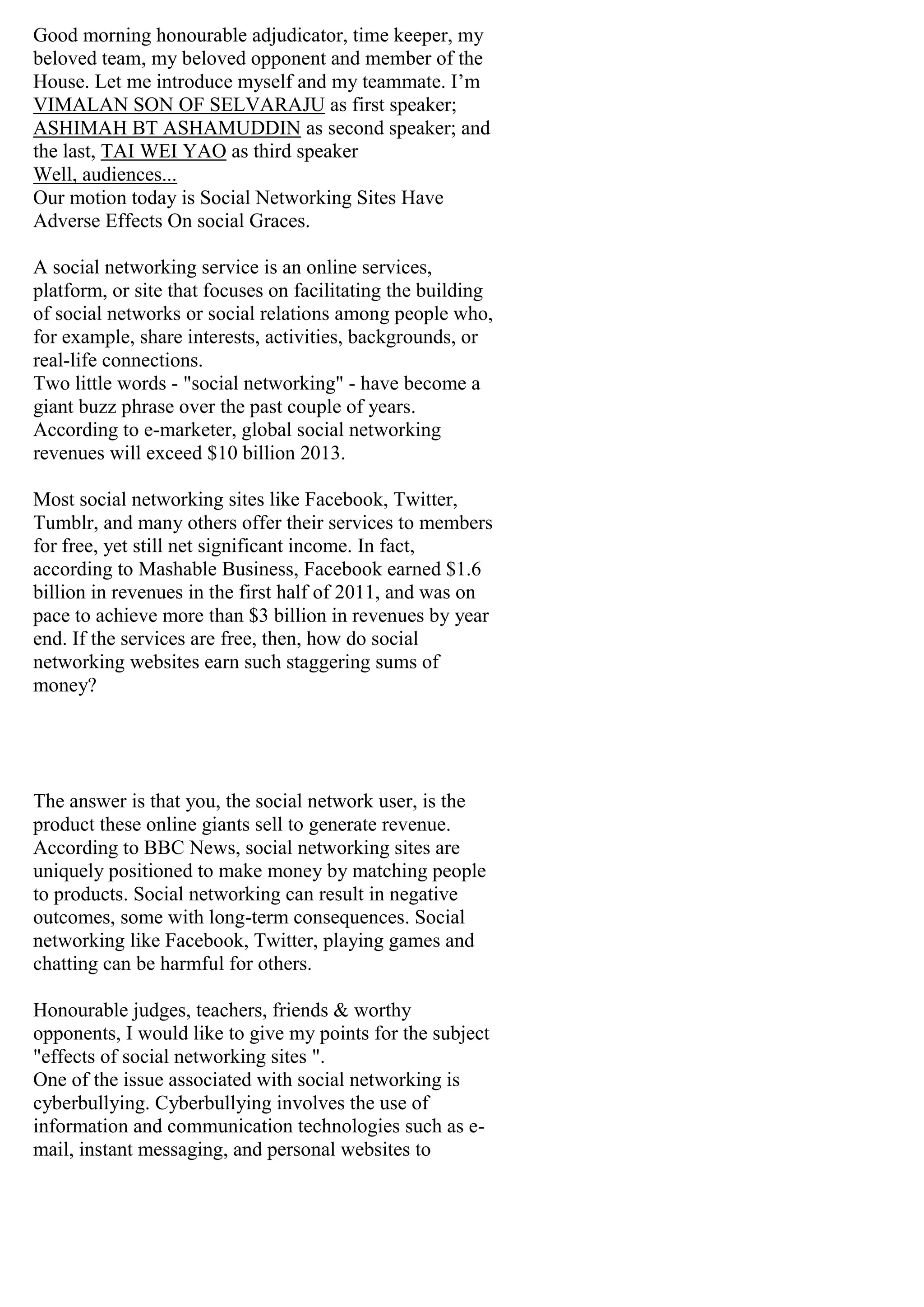 Social networking sites can have negative effects on social skills development. Some issues include cyberbullying, which 42% of students surveyed reported experiencing. Victims of cyberbullying can experience lower self-esteem, depression, and in some cases suicide. Additionally, the use of shorthand and slang on social media can negatively impact students' language skills and writing abilities if carried into schoolwork. Frequent online socializing can also reduce in-person social interactions important for developing conflict resolution and relationship building skills.
