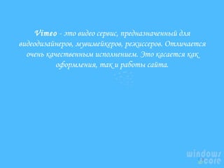 Vimeo - это видеохостинг для профессиональных видеодизайнеров и режиссеров, предлагающий высокое качество исполнения и функциональность социальной сети. Пользователи могут выбрать бесплатный режим с ограничениями или платные подписки для расширенных возможностей, включая больший объем загрузки и отсутствие рекламы. Сервис также предлагает группы и каналы для создания сообществ и обмена видеоконтентом.