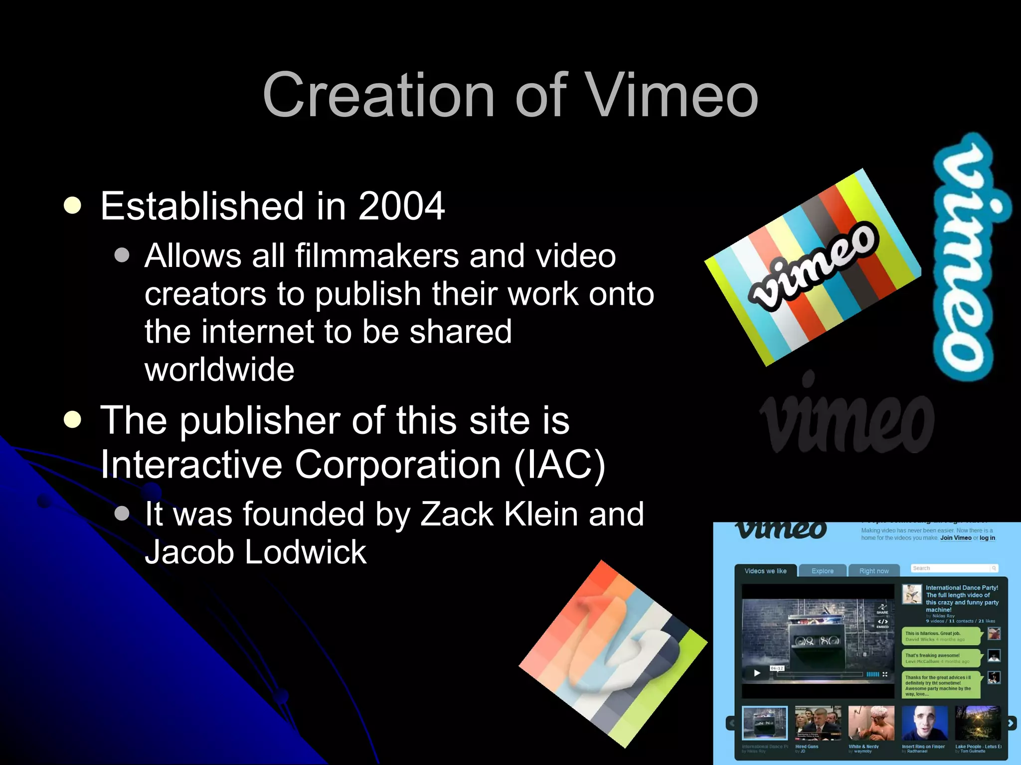 Vimeo is a website established in 2004 that allows filmmakers and video creators to publish and share their work worldwide. It was founded by Zack Klein and Jacob Lodwick and is owned by IAC (InterActiveCorp). Vimeo provides a free platform for users to post videos to share with others and allows downloading videos for offline viewing. Reviews of Vimeo have generally been positive, praising it as a good social networking tool for sharing videos, though one review criticized its lack of commercial advertisements.
