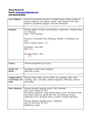 Vinay Kumar M is seeking a position in software architecture and computer security with a B.Tech in Computer Science from Jawaharlal university. He has experience with imperative programming languages and system frameworks. He is currently studying for a M.Tech in Nano Technology at Sreenidhi Institute of Science and Technology. Vinay has skills in Microsoft Visual Studio, Java, HTML, web technologies, Linux, networking, databases, and graphics. He has internship experience developing a GUI interface framework and multi-banking system. In his free time, Vinay engages in volunteer activities and holds a black belt in karate.