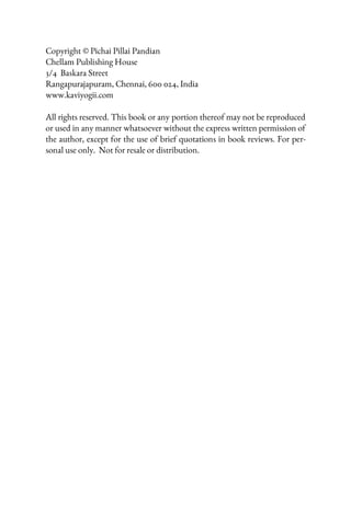 This document provides context and commentary for the Vinayagar Agaval, a short litany for daily prayer and meditation composed by St. Avvai. It explains that St. Avvai aimed to distill the essence of the monumental Tirumantiram text by Tirumoolar into a more accessible format. The Vinayagar Agaval guides the reader to meditate on Lord Vinayagar and his attributes, initially focusing on outward beauty and later moving to more subtle spiritual concepts. Lord Vinayagar is praised for initiating the reader into yoga teachings and removing obstacles on the path of self-realization through mantras and other techniques.