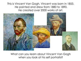 Vincent Van Gogh was a post-Impressionist painter born in 1853 who created over 2,000 works between 1880-1890. While many of his paintings during this time were dark and realistic like the styles of his contemporaries, Van Gogh was truly an expressionist who painted with feelings and impressions using bright colors and visible brush strokes. Although his works were not appreciated during his lifetime, he is now considered a master painter and his works are famous worldwide, with one painting recently selling for $90 million.