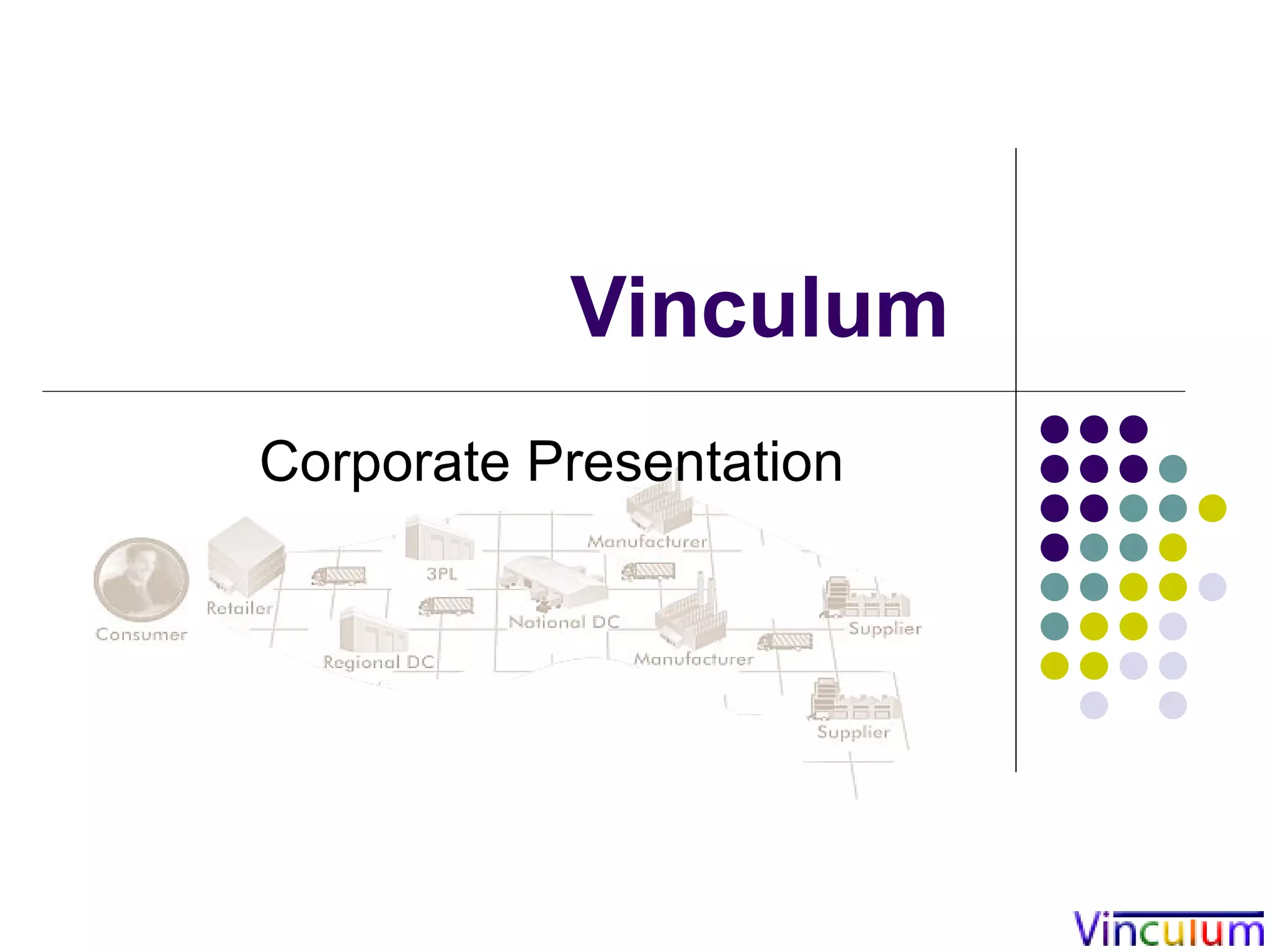 The document describes Vinculum Corporation and the various IT solutions and services it offers to customers. These include consulting, implementation, customization and support services for supply chain management, warehouse management, transportation management, CRM, procurement and enterprise data integration solutions. It also lists some of Vinculum's technology partners and implementation experience with products from companies like JDA, Infor, SAS and Sterling Commerce.