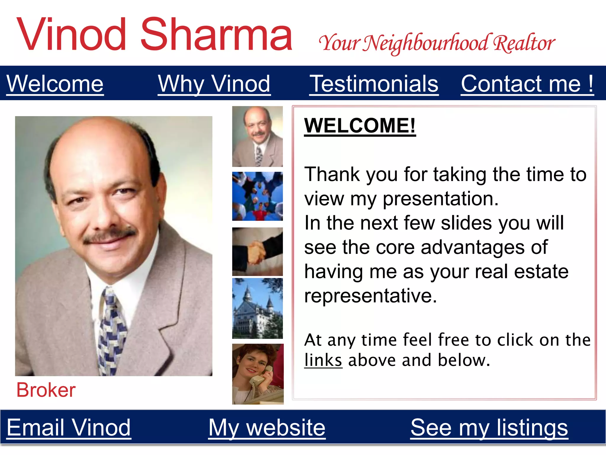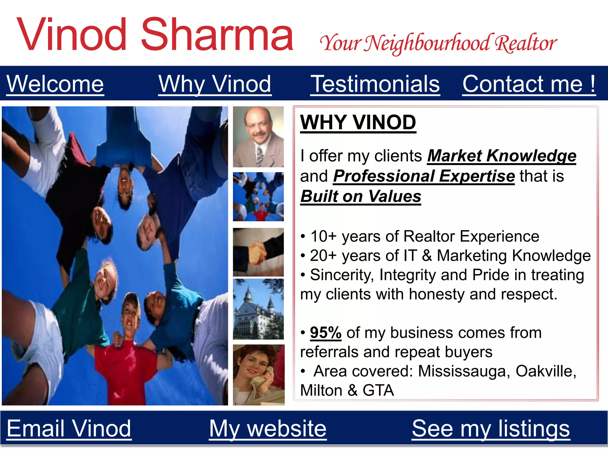 This document is a presentation by Vinod Sharma, a realtor, about his real estate services. It consists of multiple slides that highlight Vinod's experience in real estate and IT, positive testimonials from satisfied customers, and contact information if the viewer wants to work with Vinod. The slides promote Vinod's market knowledge, integrity, focus on clients' needs, and high rate of referrals and repeat business.
