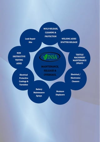 The document details a range of industrial cleaning and maintenance products, including cleaners, lubricants, and coatings designed for various applications in electrical and mechanical equipment. Each product is characterized by its specific features, such as fast evaporation, high dielectric strength, and compatibility with plastics and metals, making them suitable for tasks like removing contaminants, protecting against corrosion, and improving electrical performance. Additionally, it provides packaging sizes for each product, indicating usability across different scales of operation.