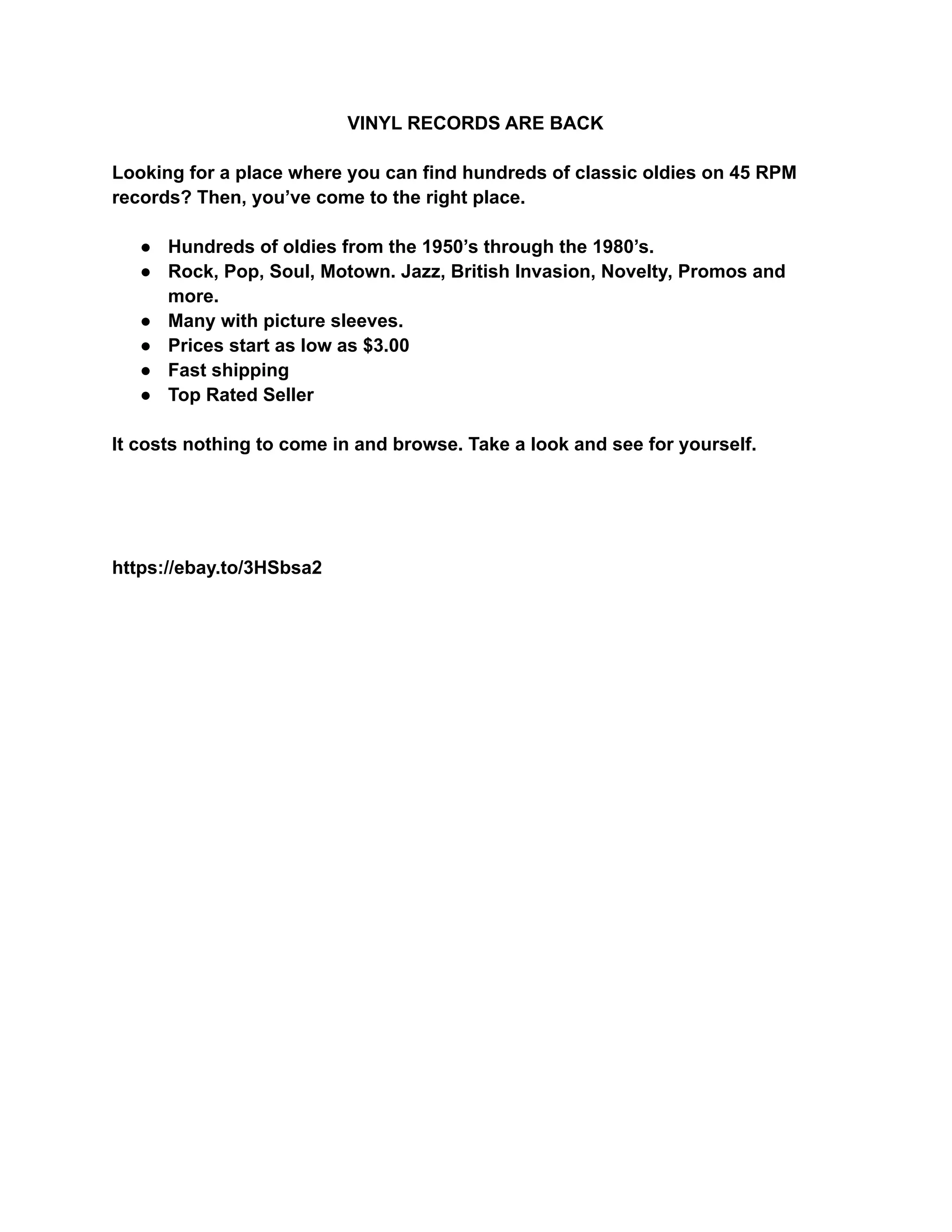 This document promotes a collection of classic vinyl records from the 1950s to the 1980s, including various genres such as rock, pop, and soul. Records are available for prices starting at $3.00, and the seller offers fast shipping and a great browsing experience.