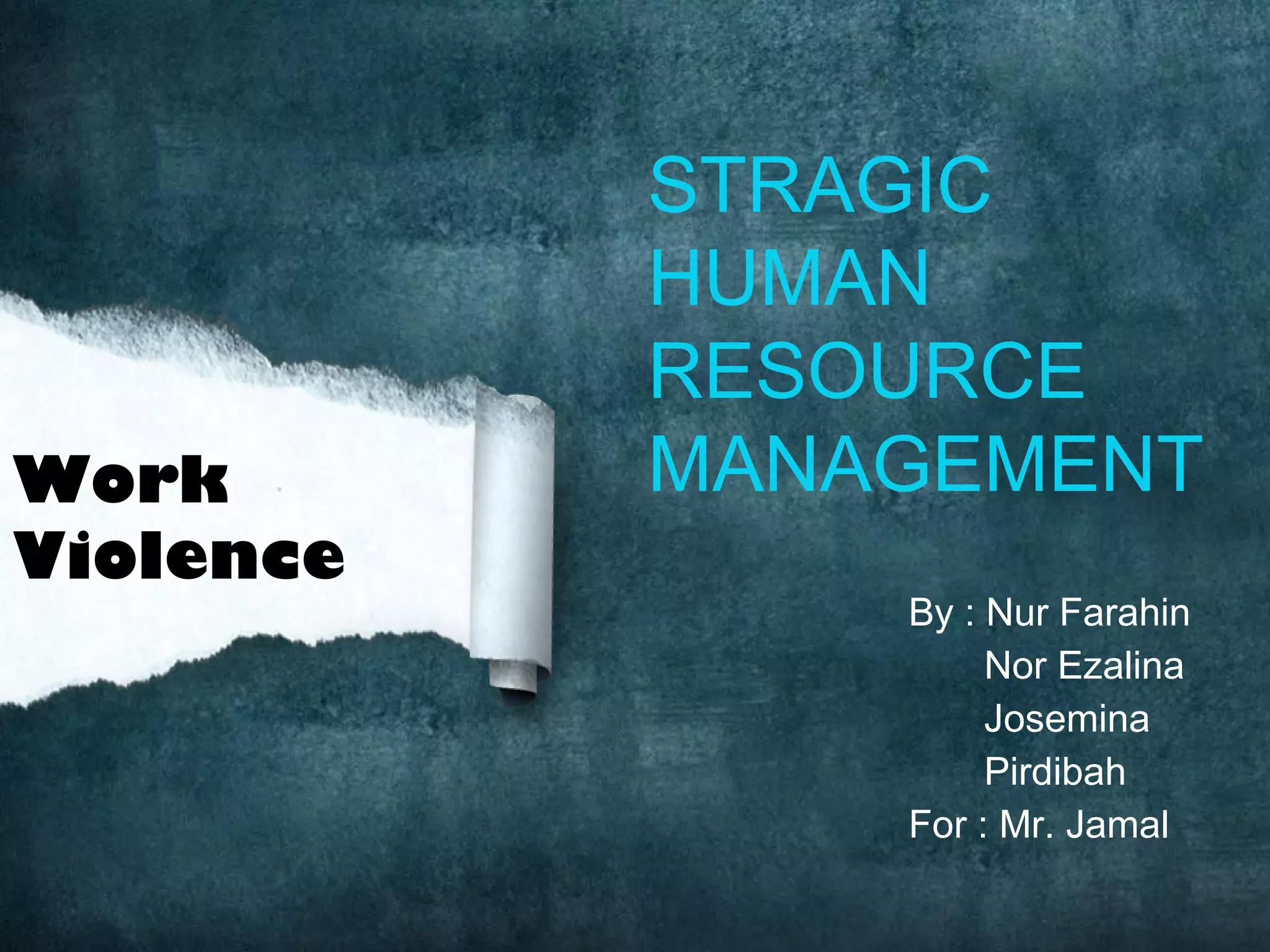 This document discusses strategies for managing workplace violence. It defines workplace violence and notes that workers in jobs involving money or transporting people/goods are most vulnerable. It recommends employers establish a zero-tolerance policy and violence prevention program. Employers should encourage reporting incidents and support victims, while employees should learn to recognize and avoid dangerous situations. The document also covers verbal threats, physical threats, and ways for employers and employees to prevent and deal with workplace violence.