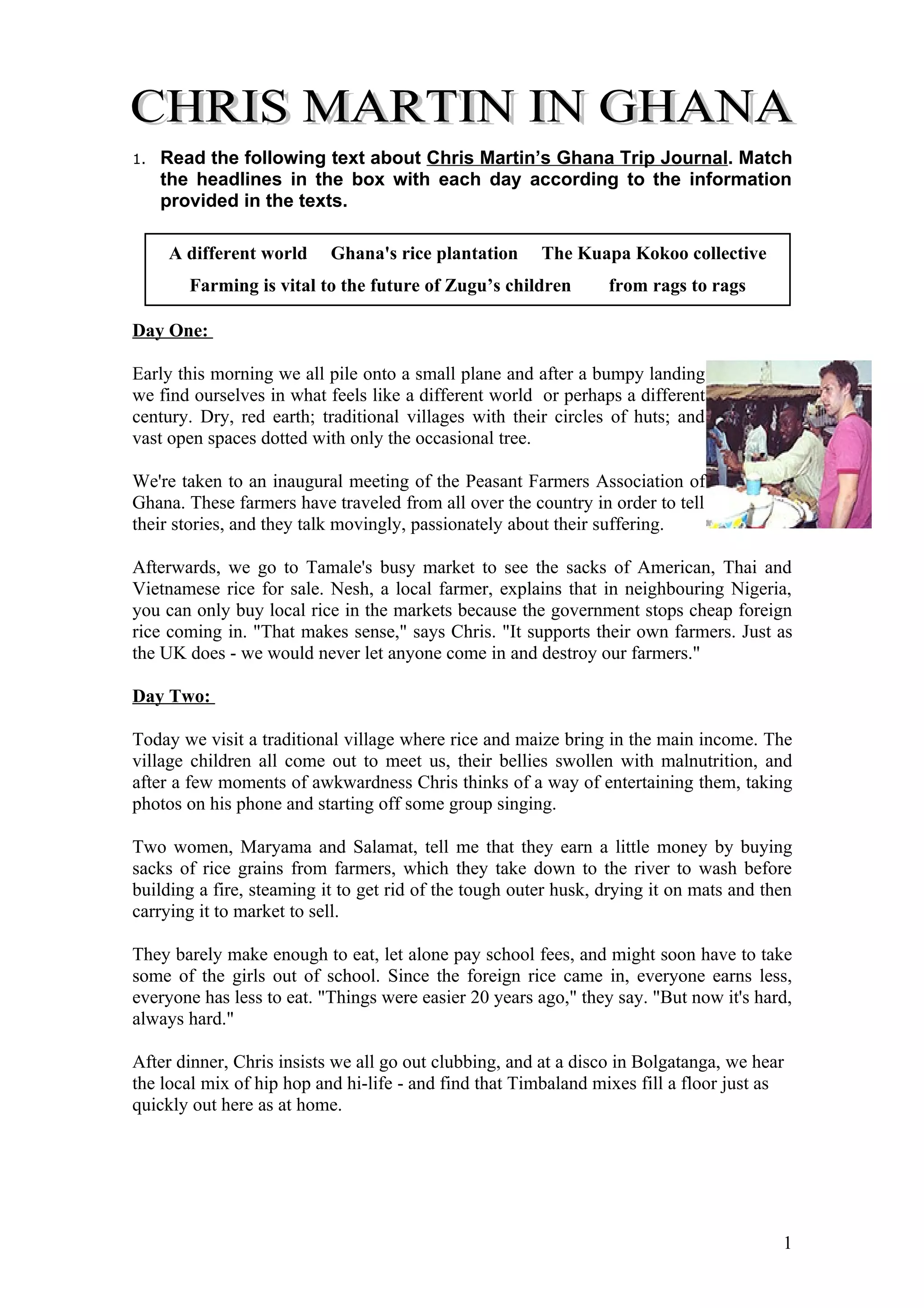 Chris Martin traveled to Ghana and kept a journal of his experiences over 5 days: Day 1: He arrived in a rural area and attended a farmer's association meeting where local farmers spoke passionately about their struggles. Day 2: He visited a village where most income came from rice and maize farming. The children had malnutrition and the farmers said things were harder since foreign rice imports increased. Day 3: Chris visited farmers supported by Oxfam and joined in singing and dancing. He also saw vast fertile lands that could produce more rice with investment in irrigation. Day 4: Chris met cocoa farmers in a village and learned how fair trade premiums helped their community with clean water and school improvements.