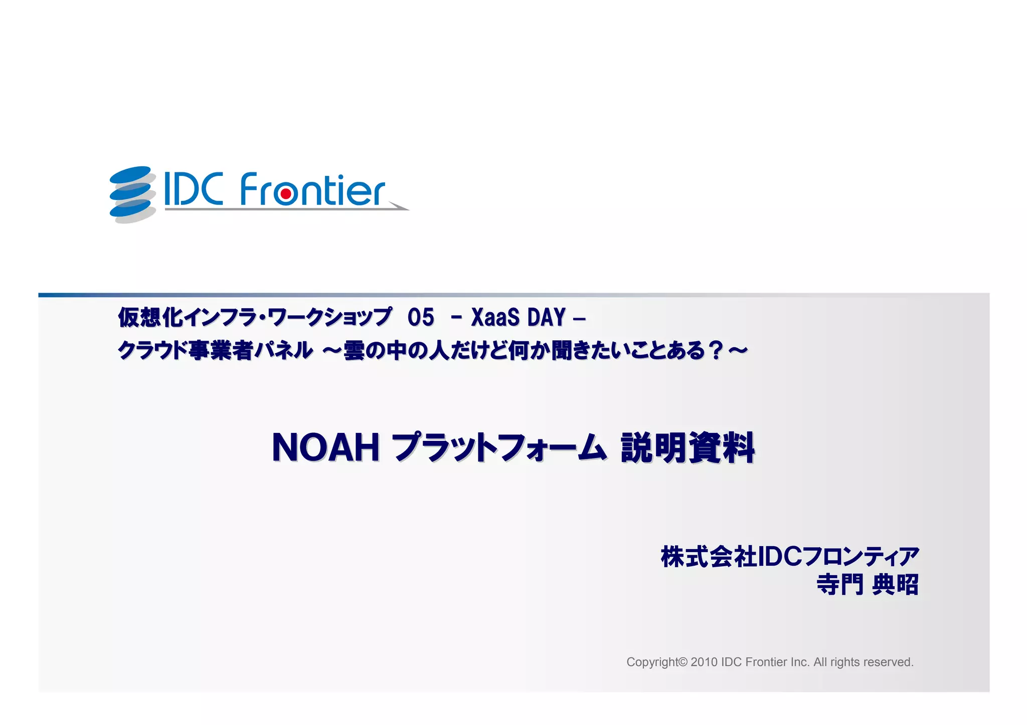 VIOPS05: NOAH プラットフォーム説明資料 株式会社IDCフロンティア 寺門典昭 2010年7月23日(金曜日)10:00-17:30 VIOPS05 WORKSHOP Virtualized Infrastructures Workshop [05]