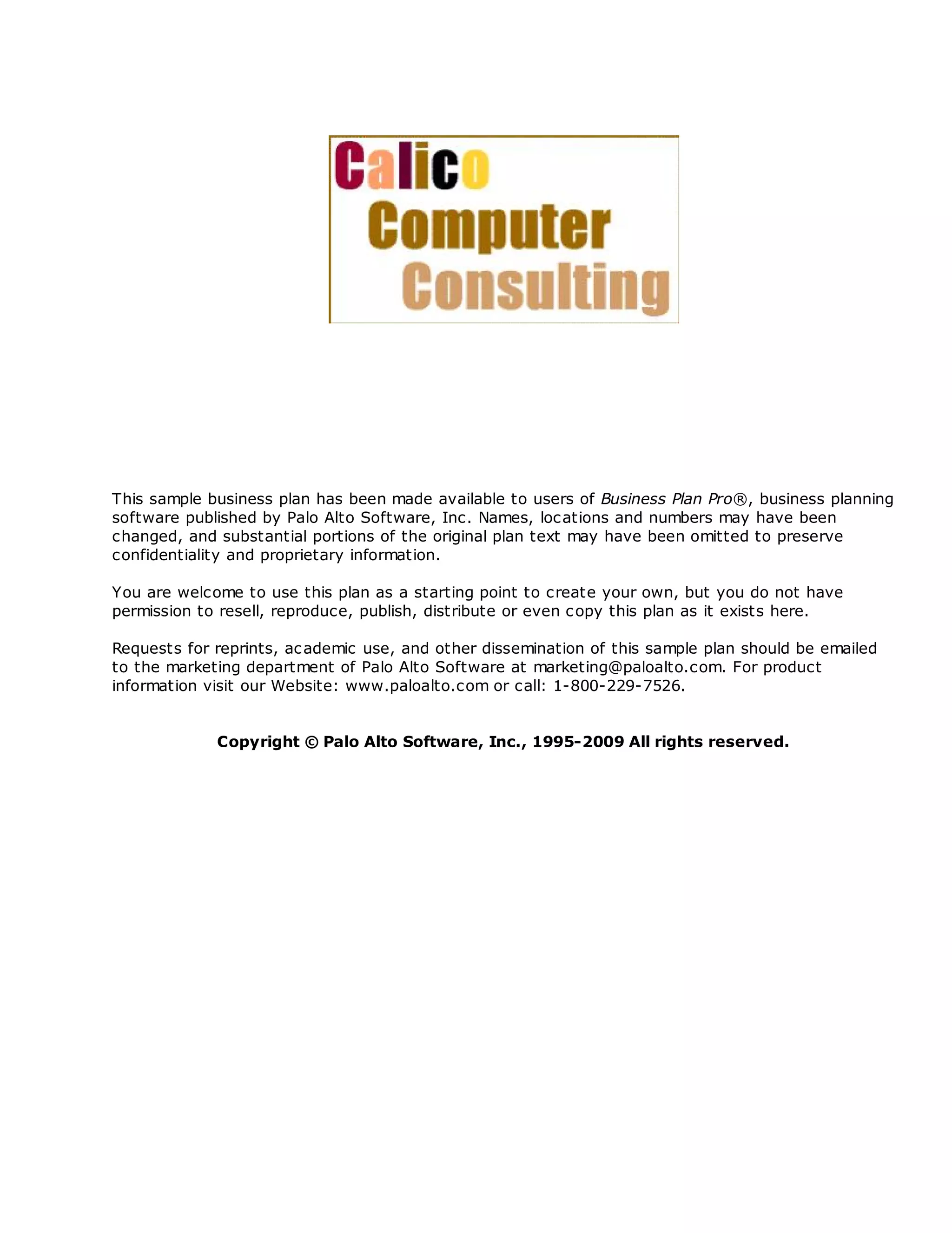 This document summarizes a business plan for Calico Computer Consulting, a sole proprietorship providing technical computer assistance. The plan projects rapid growth and high profits over three years by offering hourly technical aid, retainer contracts, and project consulting. Marketing will focus on networking, responsiveness, quality work, and generating repeat customers locally. The startup requires $2,050 from the owner and offers a low-cost entry into a lucrative industry.